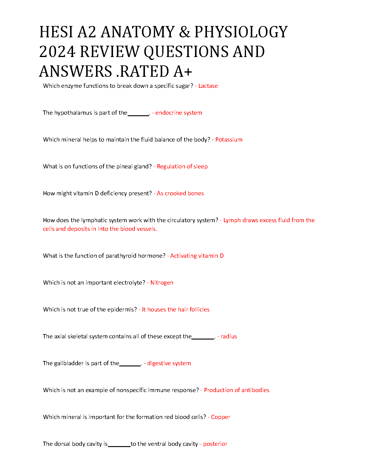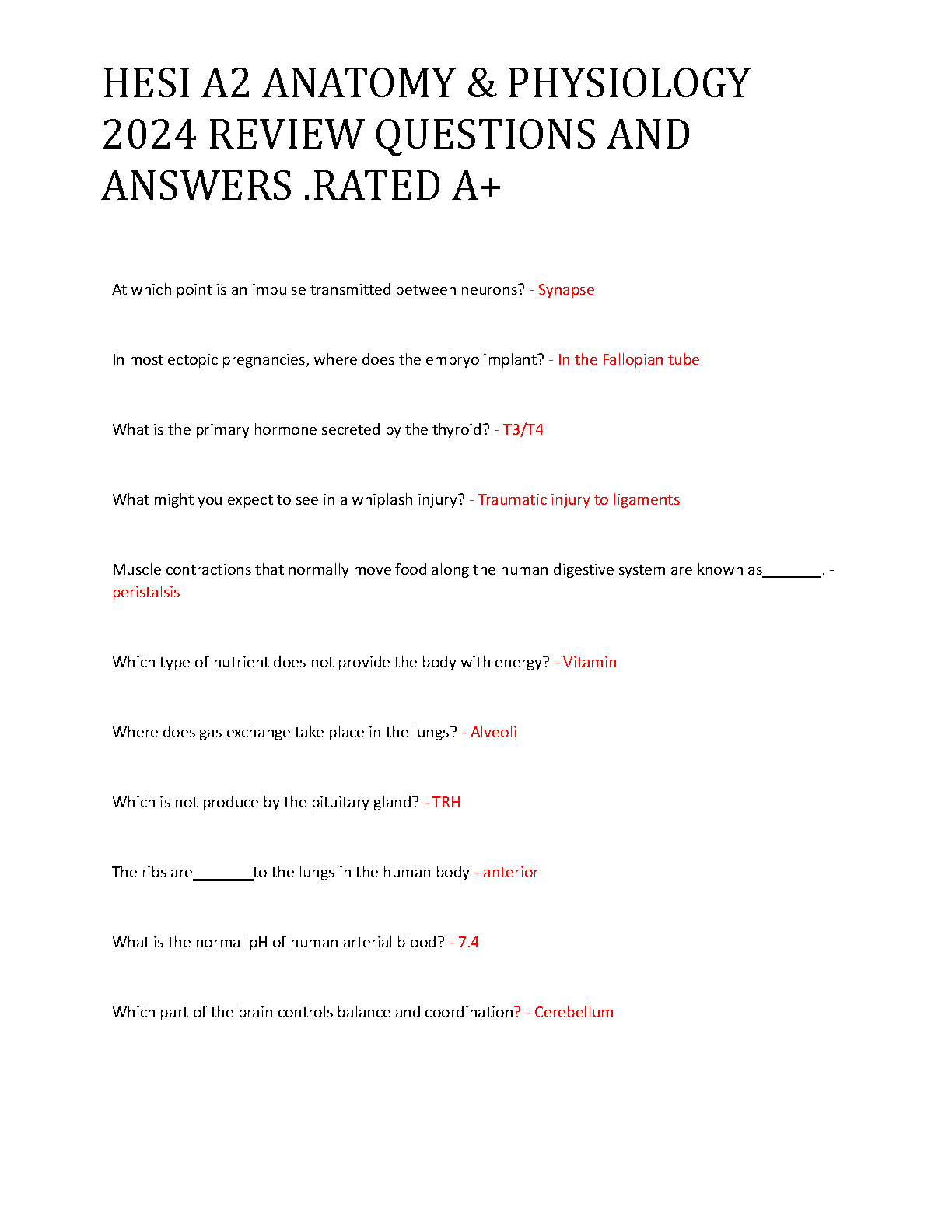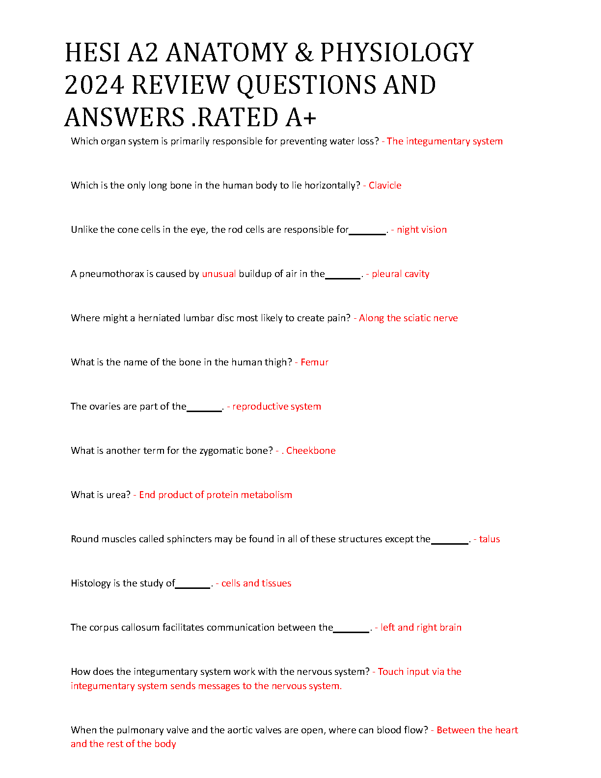 HESI A2 Anatomy & Physiology 2024 Review Questions and Answers - Achieve A+