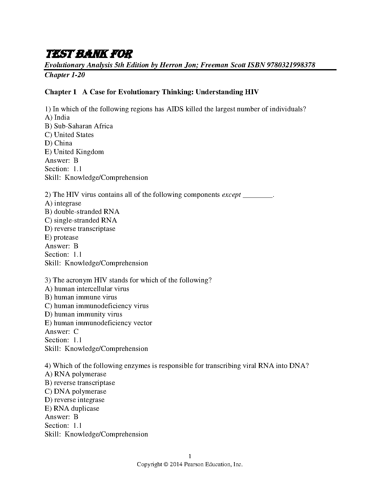 Evolutionary Analysis 5th Edition Test Bank by Herron & Scott: Chapter 1-20