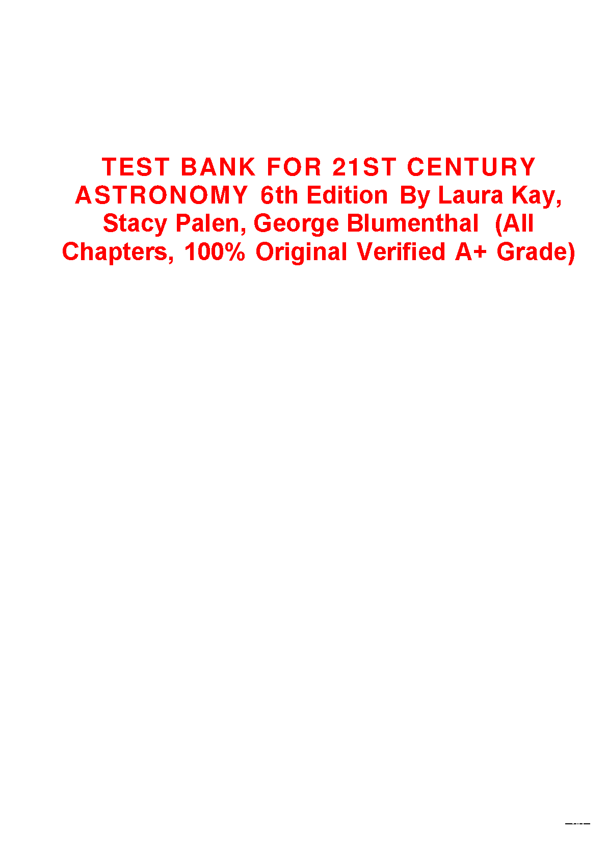 Elevate your understanding and secure top grades with this comprehensive test bank for '21st Century Astronomy, 6th Edition.' Authored by renowned educators Laura Kay, Stacy Palen, and George Blumenthal, this essential resource features 100% original and verified questions covering every chapter. Designed to ensure success for the 2025/2026 academic year, it's your ultimate tool to prepare thoroughly, ace your exams on the first attempt, and avoid costly resits, ensuring you achieve an A+ grade in your astronomy course.