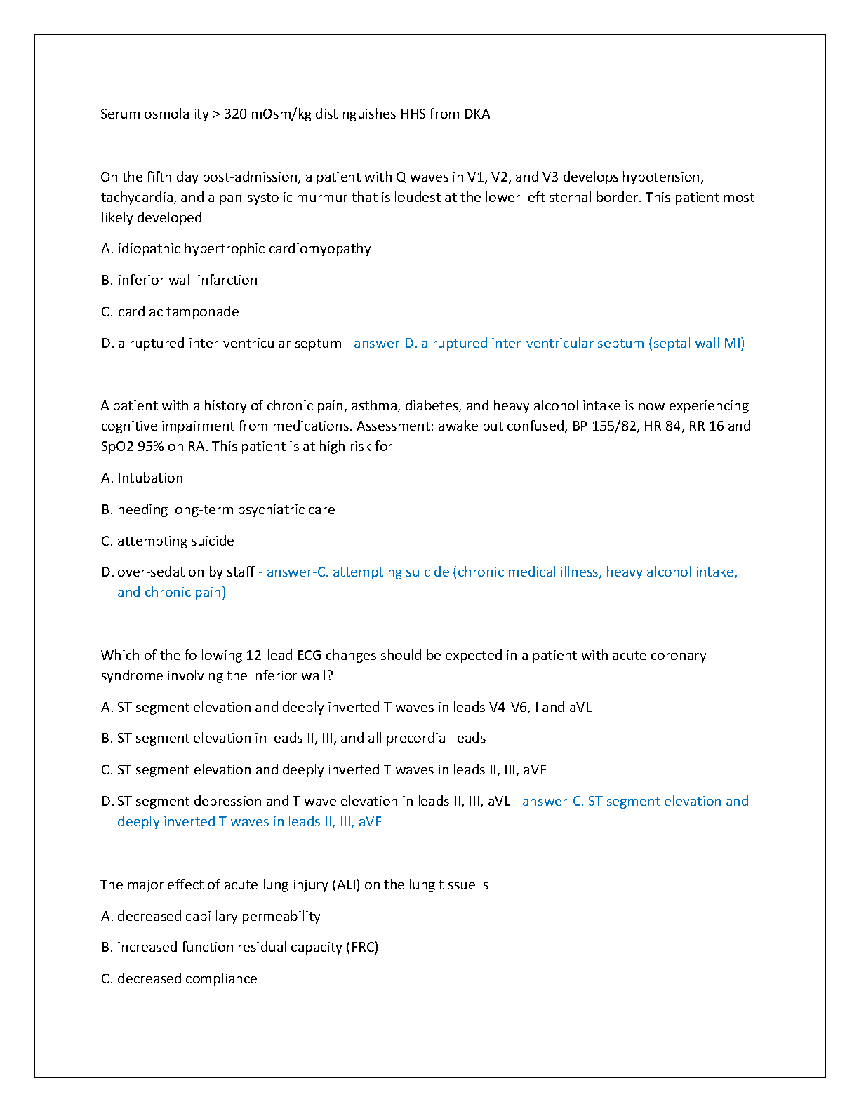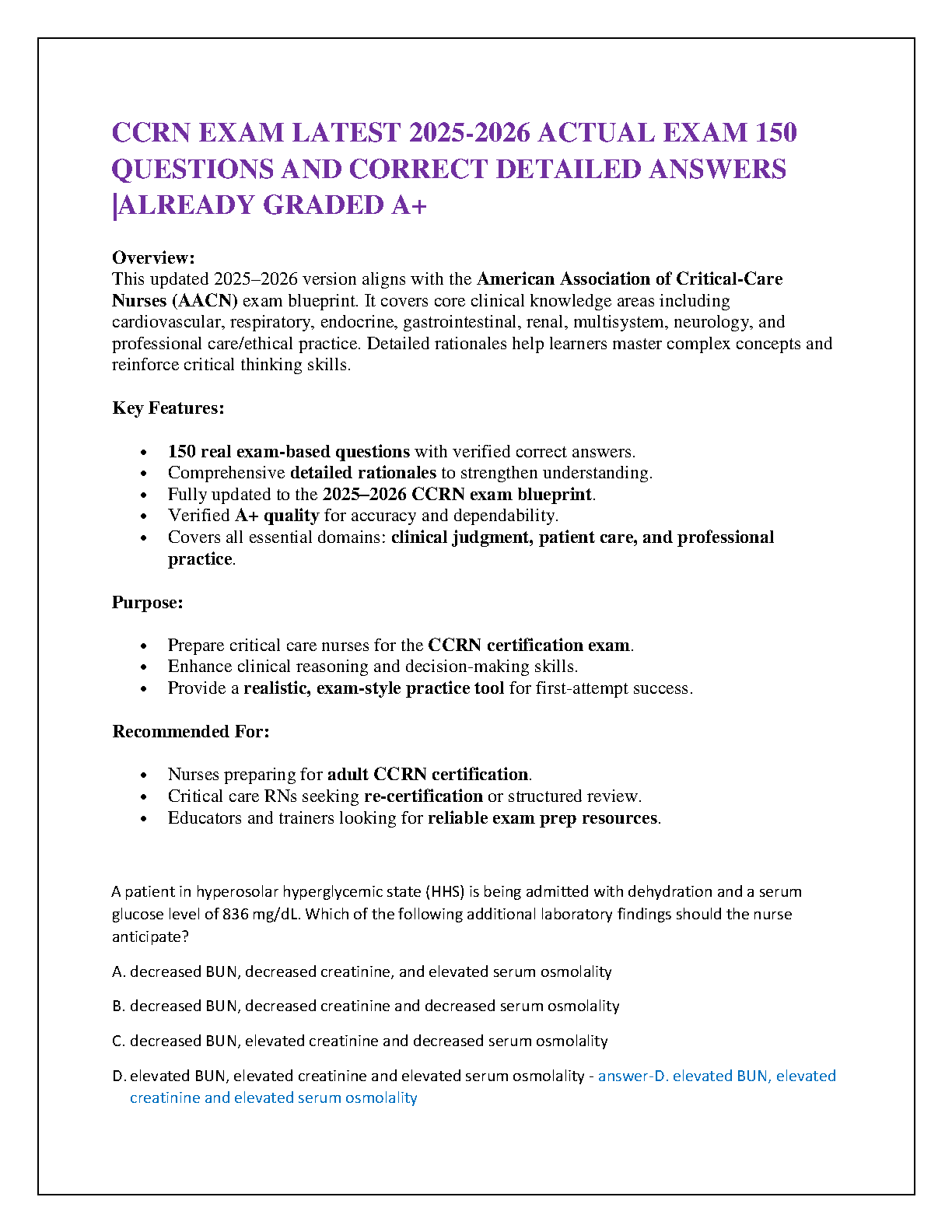 Master your Adult CCRN Certification Exam with this comprehensive Test Bank, meticulously updated for the 2025-2026 blueprint. This essential resource features over 150 real exam-style questions, each accompanied by detailed, A+-graded rationales to deepen your understanding and enhance critical thinking. Fully aligned with the latest American Association of Critical-Care Nurses (AACN) exam outline, it rigorously covers all essential domains: clinical judgment, patient care, and professional practice. Ideal for nurses seeking initial certification, re-certification, or educators looking for a reliable, exam-focused study tool to ensure first-attempt success.