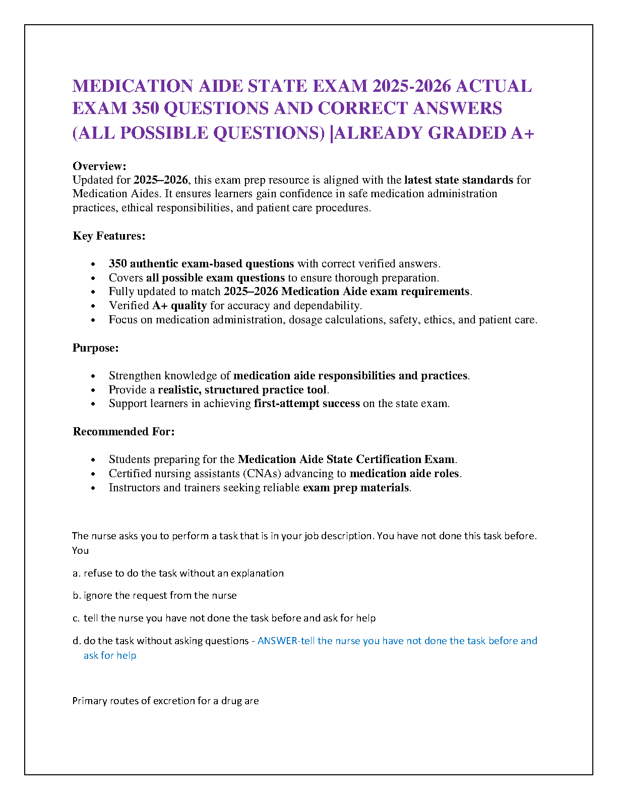 Master the Medication Aide State Certification Exam with this comprehensive 2025-2026 prep resource. Featuring 350 authentic, exam-based questions with correct, verified answers, this guide covers all possible scenarios to ensure thorough preparation and first-attempt success. Ideal for students, CNAs, and instructors seeking reliable study materials focused on safe medication administration, dosage calculations, ethics, and patient care.