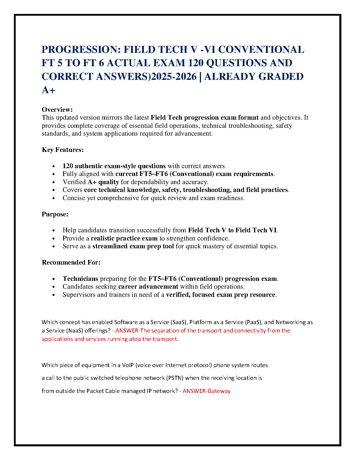 Prepare confidently for the 2025-2026 Field Tech V-VI (Conventional) FT5-FT6 Progression Exam with this meticulously updated test bank. Reflecting the latest exam format and objectives, this resource provides complete, up-to-date coverage of essential field operations, technical troubleshooting, safety standards, and system applications crucial for career advancement. Gain access to 120 authentic, exam-style questions, each with verified A+ graded answers, ensuring unparalleled dependability and accuracy. This comprehensive yet concise tool covers core technical knowledge and practical field practices, designed for rapid review and optimal exam readiness. Ideal for technicians diligently preparing for progression, candidates seeking career advancement, and supervisors/trainers needing a focused, proven study resource. Master essential topics and confidently pass your Field Tech V to Field Tech VI exam on your first try, avoiding resits.