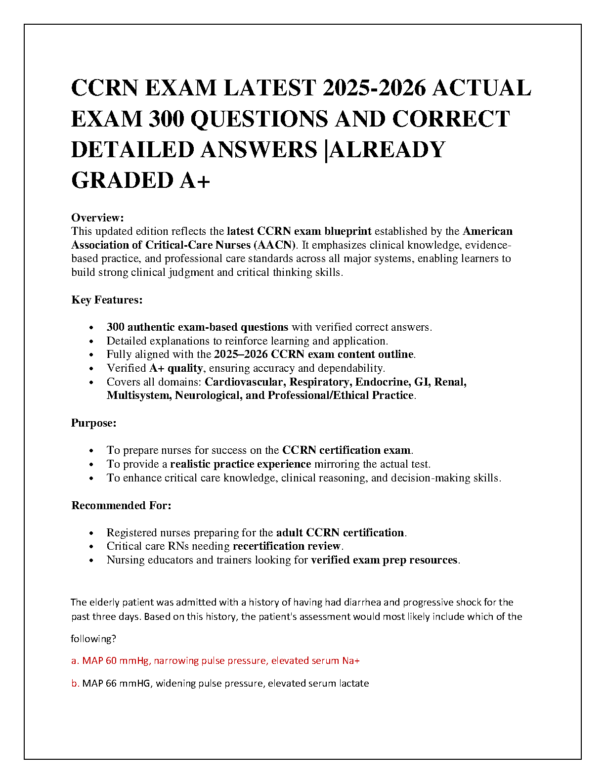 Ace your CCRN certification exam with this comprehensive study guide for the 2025-2026 academic year. Featuring 300 authentic, exam-based questions with verified correct answers and detailed explanations, this resource is designed to enhance your clinical knowledge, critical reasoning, and decision-making skills. Fully aligned with the latest CCRN exam blueprint established by the American Association of Critical-Care Nurses (AACN), it covers all essential domains including Cardiovascular, Respiratory, Endocrine, GI, Renal, Multisystem, Neurological, and Professional/Ethical Practice. Ideal for registered nurses preparing for adult CCRN certification, critical care RNs needing recertification review, and nursing educators seeking verified exam prep resources.