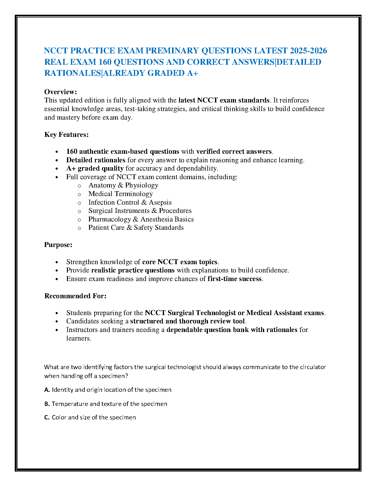 Master the NCCT Surgical Technologist and Medical Assistant certification exams with this definitive 2025-2026 Practice Exam Test Bank. Meticulously updated and fully aligned with the latest NCCT exam standards, this essential resource features 160 authentic, exam-based questions, each accompanied by verified correct answers and comprehensive, detailed rationales for profound understanding. Designed for A+ graded quality and dependability, it provides full coverage of critical NCCT content domains, including Anatomy & Physiology, Medical Terminology, Infection Control & Asepsis, Surgical Instruments & Procedures, Pharmacology & Anesthesia Basics, and Patient Care & Safety Standards. This powerful tool is engineered to build your confidence, ensure complete exam readiness, and equip you for guaranteed success in passing your NCCT certification exam on your very first attempt, effectively eliminating the need for costly resits.
