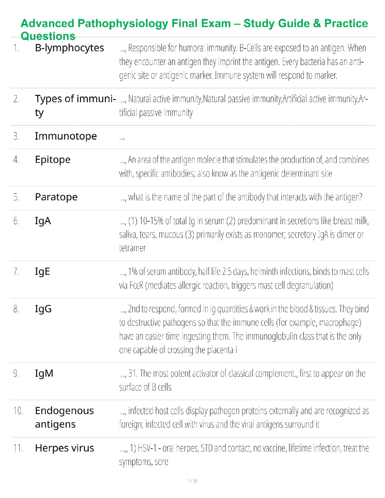 Master Pathophysiology for your final exams with this comprehensive study guide and practice questions. Covering essential topics like B-lymphocytes, types of immunity, immunotopes, epitopes, and immunoglobulins (IgA, IgE, IgG, IgM), this resource is designed to help students achieve first-attempt success and avoid resits. Ideal for the upcoming 2025/2026 academic year.