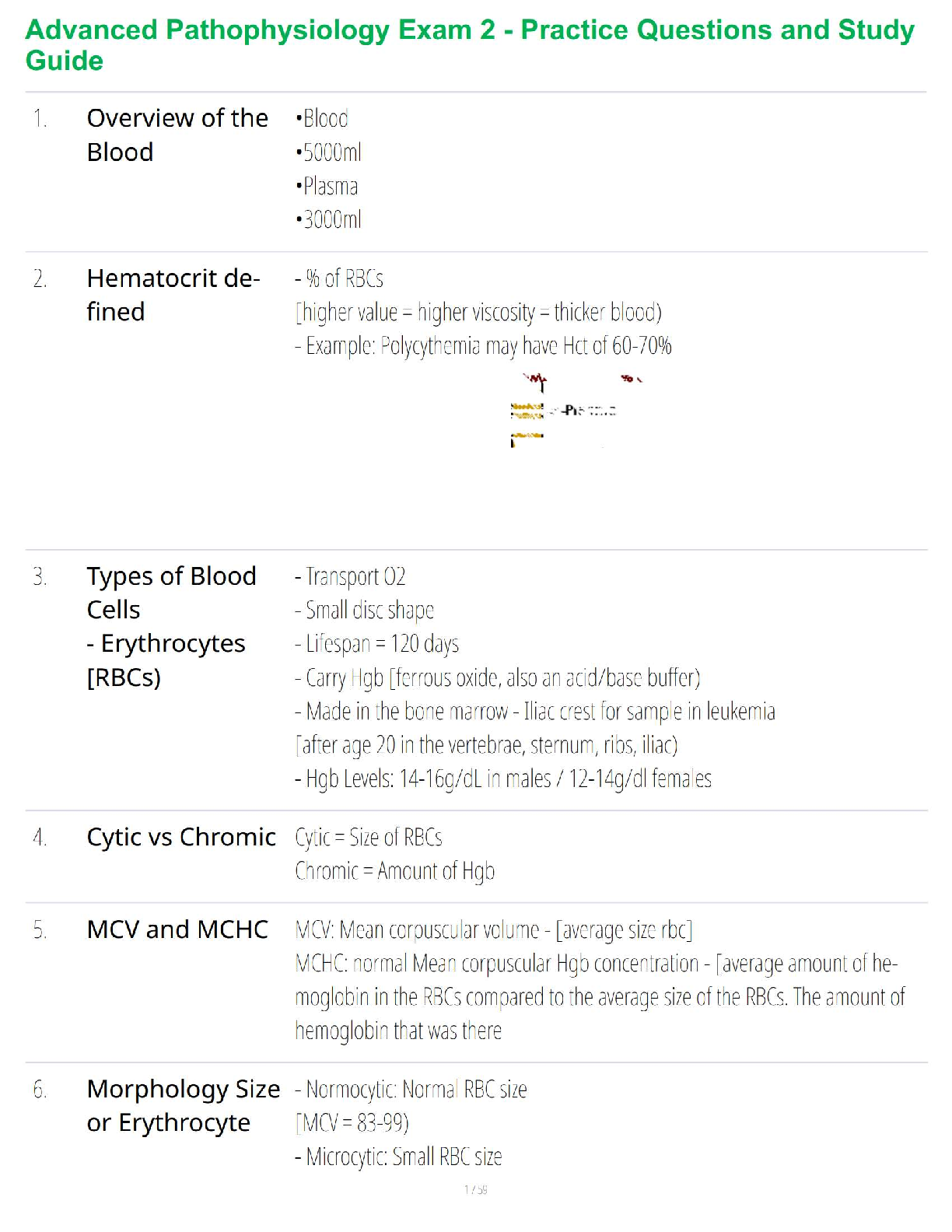 Master Advanced Pathophysiology Exam 2 with this comprehensive practice questions and study guide. Designed to help students achieve success on their first attempt and avoid resits for the 2025-2026 academic year. This resource covers key topics like blood overview, hematocrit, blood cell types (erythrocytes), cytic vs. chromic red blood cells, MCV, MCHC, and erythrocyte morphology.