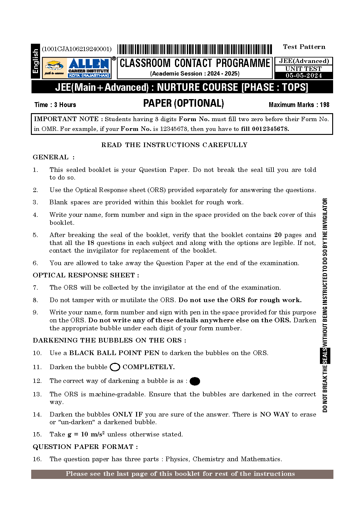 This resource provides the optional paper for the Allen Institute's JEE (Main + Advanced) Nurture Course Unit Test, covering Physics, Chemistry, and Mathematics for the 2024-2025 academic session. It includes essential instructions for students on filling the OMR sheet, darkening bubbles correctly, and verifying the paper's integrity. This paper is designed to help students master exam formats and improve their performance for the upcoming academic year.