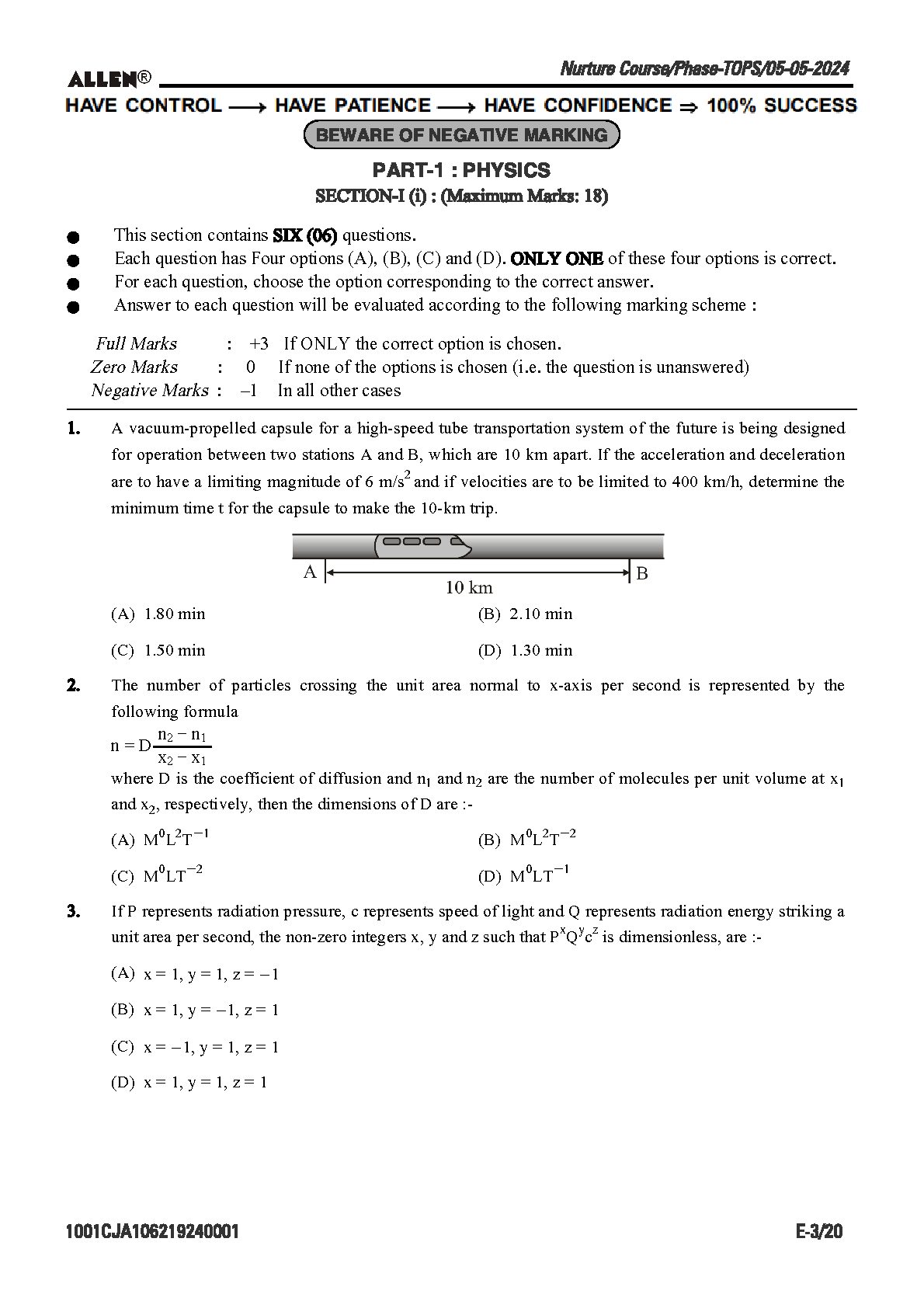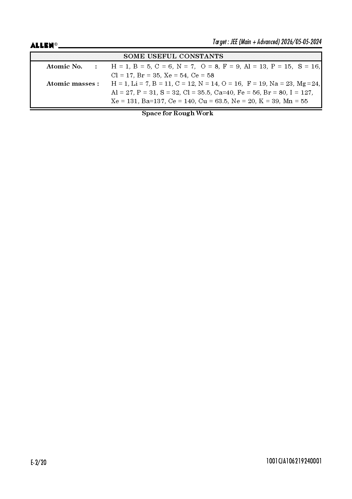 Allen Institute JEE (Main + Advanced) Nurture Course 2024-2025 Unit Test: Physics, Chemistry & Mathematics (Optional Paper)