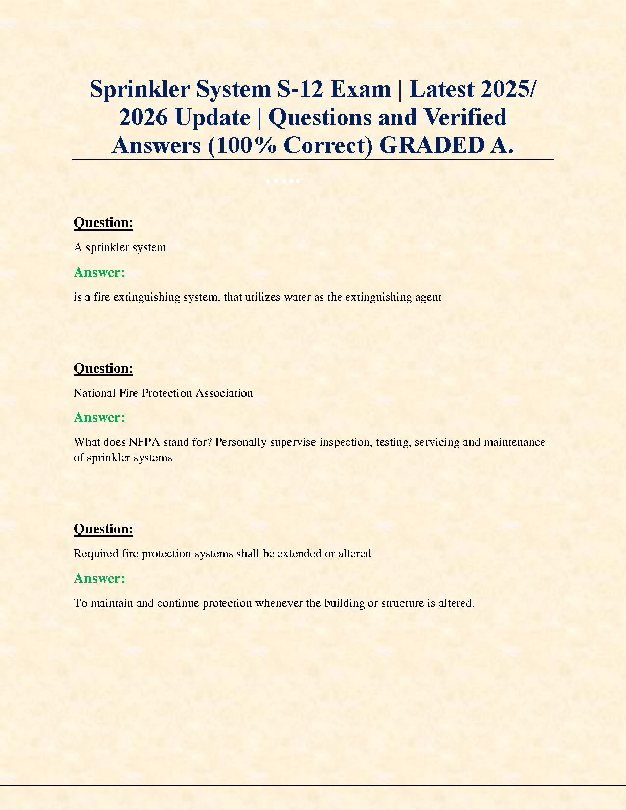 NFPA Sprinkler Systems S-12 Exam Prep: 2025/2026 Latest Questions & Verified Answers to Ace Your First Attempt