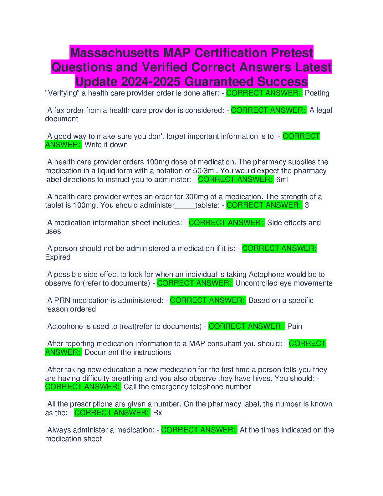Ace your Massachusetts Medication Administration Program (MAP) Certification exam with this ultimate 2024-2025 Test Bank. Featuring carefully curated pretest questions paired with verified correct answers, this resource is meticulously designed to ensure you gain the confidence and knowledge needed to pass on your very first attempt, effectively avoiding costly and stressful resits. Stay ahead with the latest, most relevant content for the upcoming academic year. Perfect for comprehensive exam preparation and reinforcing key medication administration concepts.