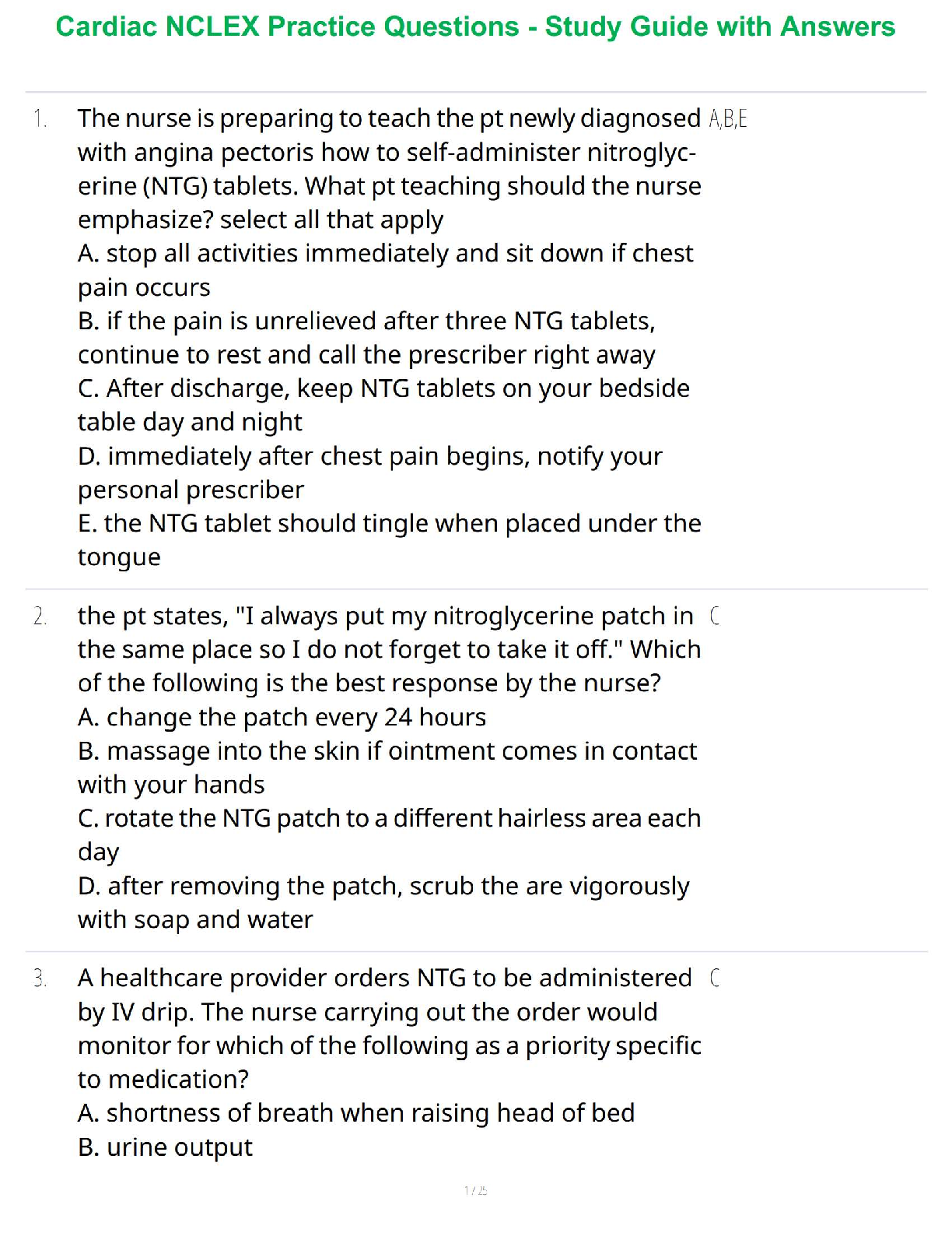 Master crucial cardiac nursing concepts for the NCLEX with this comprehensive 2025/2026 study guide and practice question set. Designed to boost your confidence and ensure you pass your NCLEX examination on your very first attempt, effectively avoiding costly resits. This invaluable resource features expertly crafted questions covering key cardiac conditions, essential pharmacology (including detailed nitroglycerin management), and realistic patient care scenarios, complete with in-depth answers to significantly deepen your understanding. Perfect for aspiring registered nurses aiming for guaranteed exam success and a robust foundation in cardiovascular health.