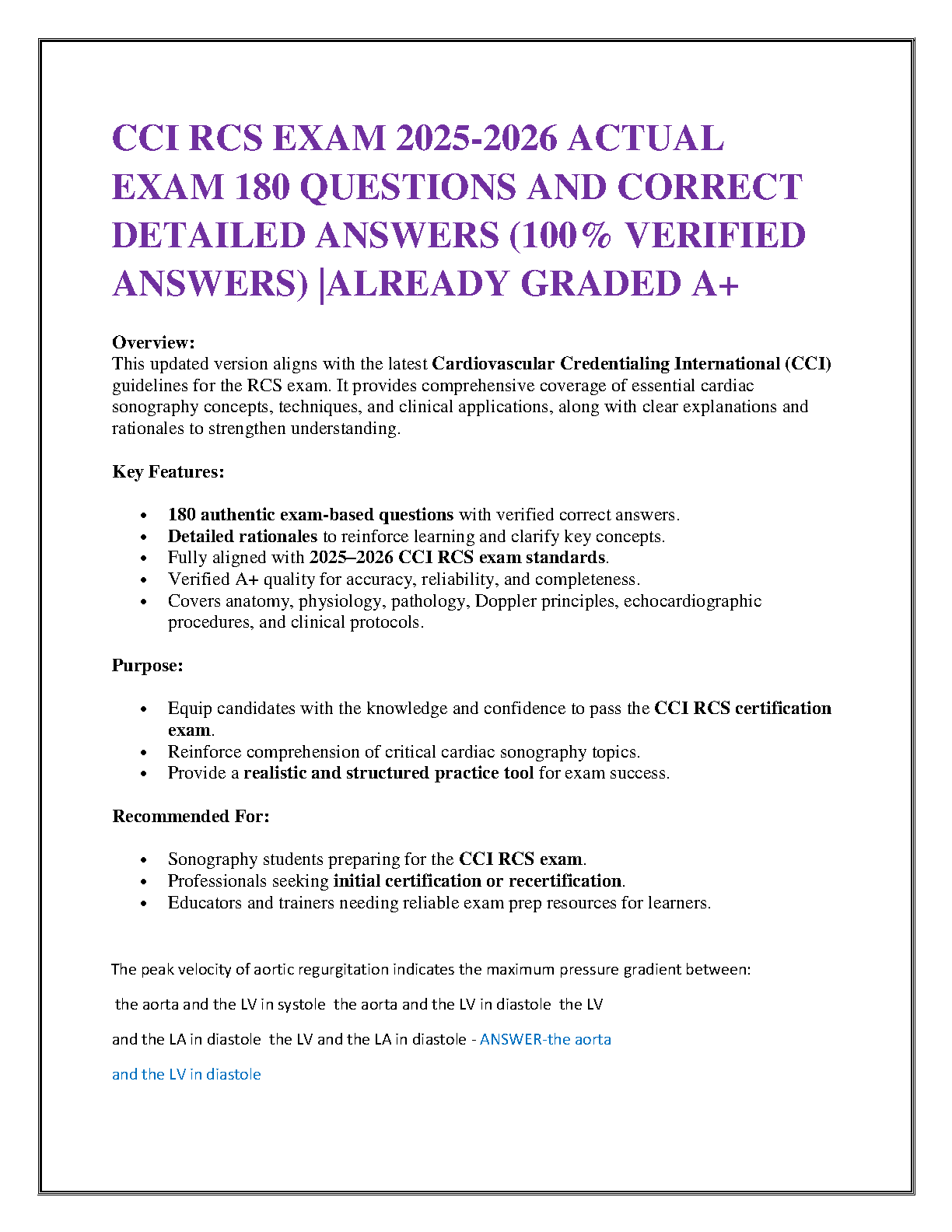 Master the CCI RCS exam with this essential study resource, meticulously designed for the 2025-2026 academic year. Featuring 180 authentic, exam-based questions with 100% verified correct answers and detailed rationales, this guide ensures you grasp all critical cardiac sonography concepts, techniques, and clinical applications. It covers anatomy, physiology, pathology, Doppler principles, and clinical protocols, aligning perfectly with the latest CCI guidelines. This updated version is your ultimate tool to build confidence, reinforce understanding, and equip yourself for success on your first attempt, avoiding resits.