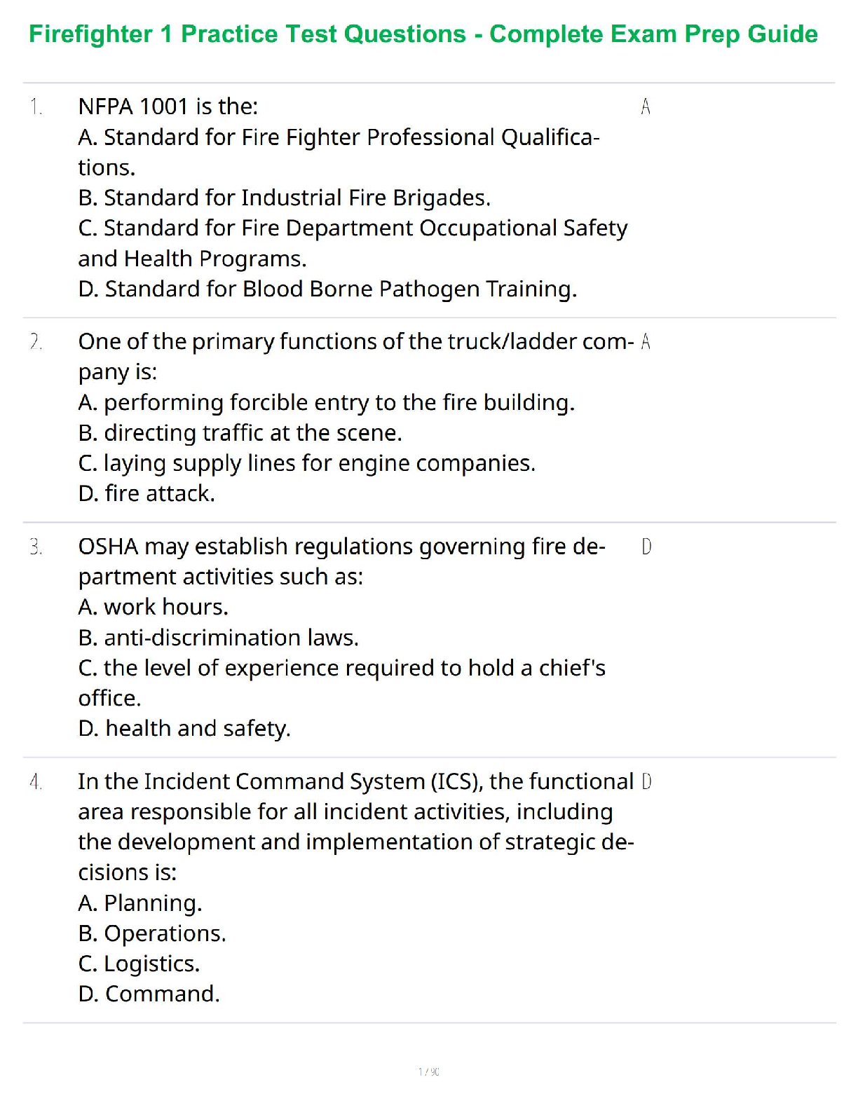 Prepare for your Firefighter 1 certification with this comprehensive practice test bank, meticulously designed to help you pass your exams on the first attempt. Aligned with the latest Firefighter I curriculum and based on key concepts from the International Fire Service Training Association (IFSTA)'s 'Essentials of Fire Fighting and Fire Department Operations, 7th Edition,' this resource features realistic questions covering crucial topics like NFPA standards, Incident Command Systems, apparatus functions, and safety protocols. Sharpen your knowledge, build confidence, and successfully achieve your Firefighter 1 certification without the need for costly resits.