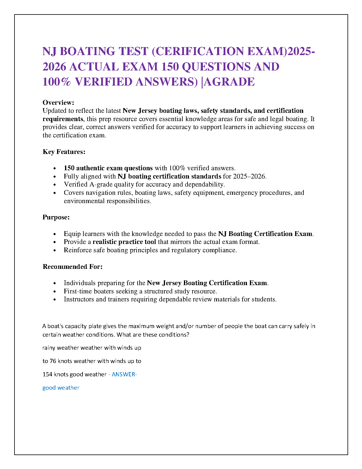 Master the New Jersey Boating Certification Exam with this comprehensive prep resource. Featuring 150 authentic questions and 100% verified answers, this guide is fully aligned with the latest 2025-2026 boating laws, safety standards, and certification requirements. Ideal for individuals preparing for the exam, first-time boaters seeking a structured study tool, and instructors, this resource ensures you have the essential knowledge to pass on your first attempt and avoid resits.