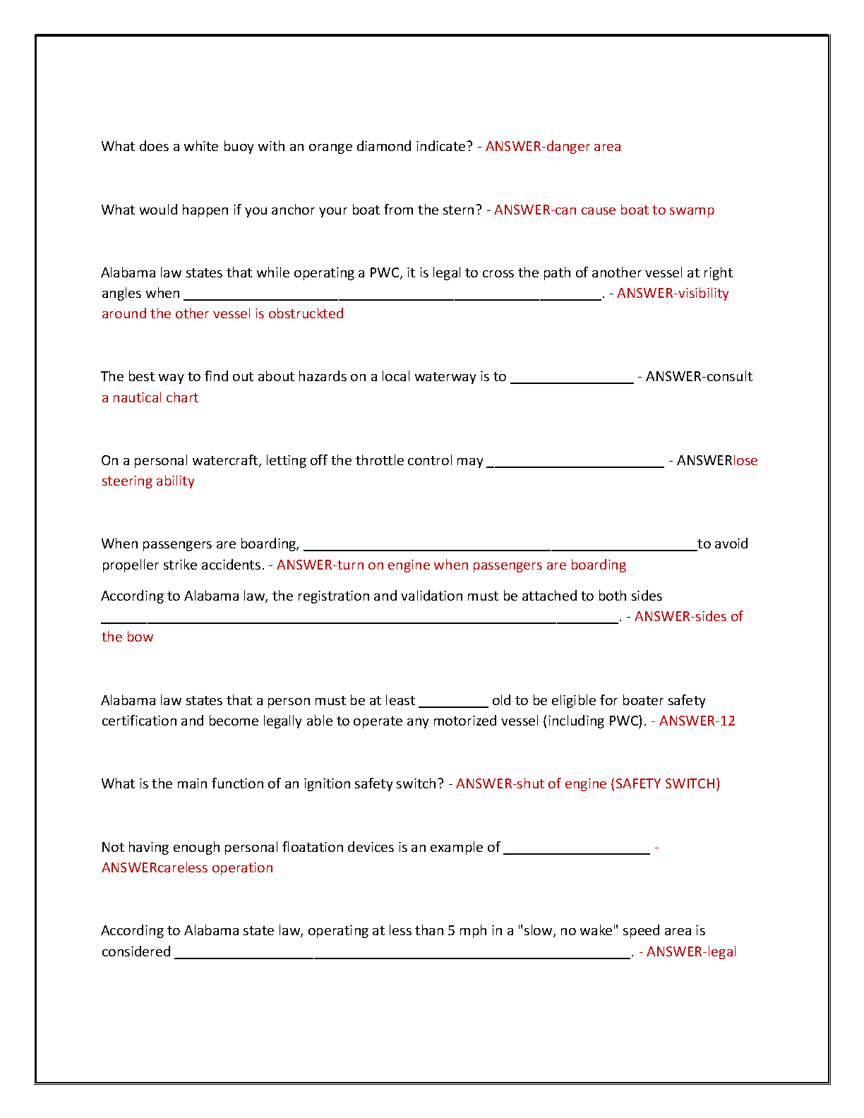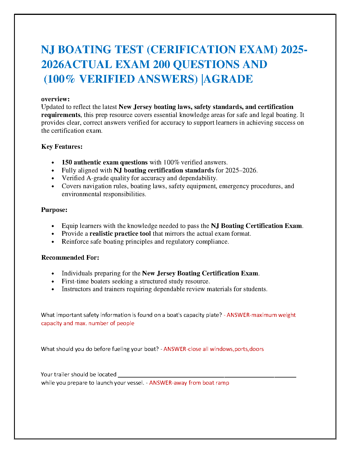 Master the New Jersey Boating Certification Exam with this comprehensive study guide, featuring 200 authentic questions and 100% verified answers for the 2025-2026 academic year. Fully aligned with the latest NJ boating laws and safety standards, this resource provides a realistic practice tool designed to equip you with the essential knowledge needed to pass on your first attempt and avoid resits. Ideal for individuals preparing for certification, first-time boaters, and instructors seeking reliable review materials.