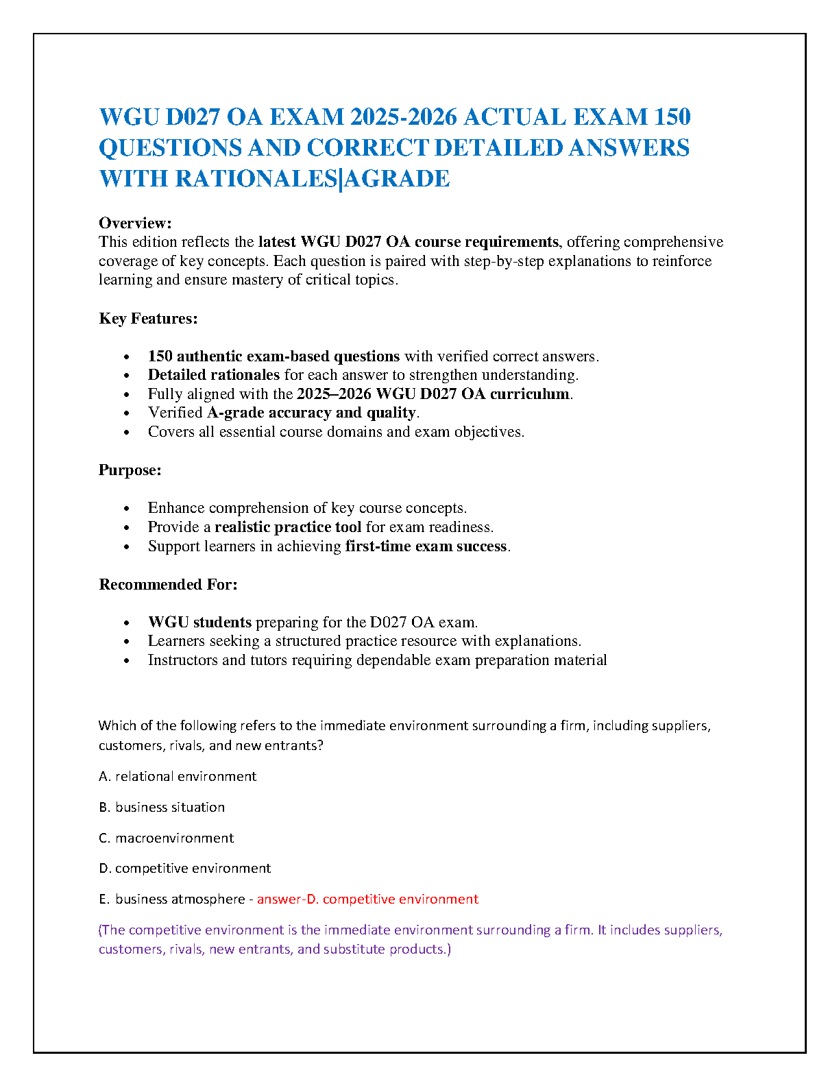 Master the WGU D027 OA exam with this comprehensive resource. Featuring 150 authentic, exam-based questions with verified correct answers and detailed rationales, this guide is fully aligned with the 2025-2026 WGU D027 OA curriculum. Enhance your comprehension of key concepts and provide yourself with a realistic practice tool to ensure first-time exam success and avoid resits. Ideal for WGU students and learners seeking structured, dependable exam preparation.