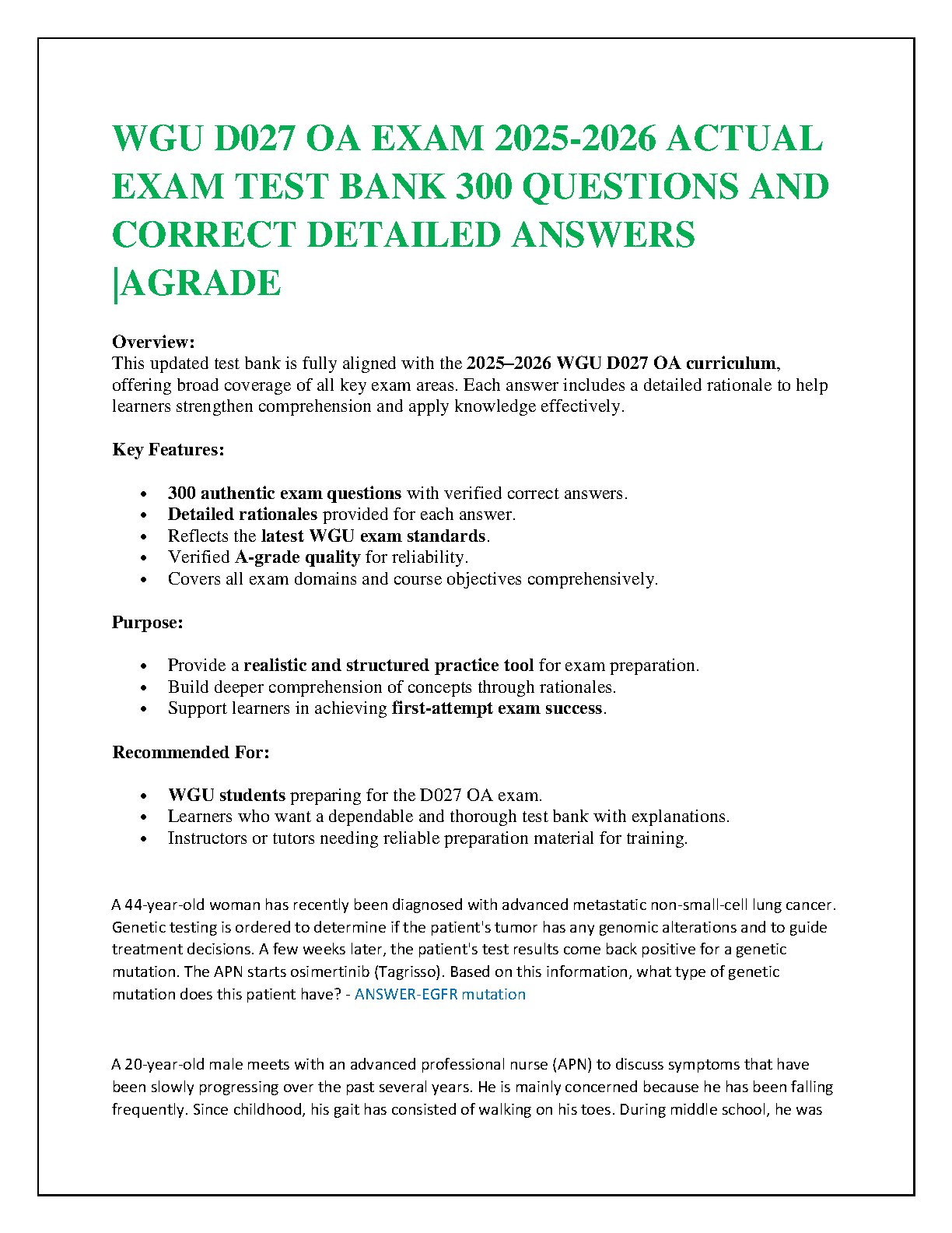 Master the WGU D027 OA exam with this updated test bank, fully aligned with the 2025-2026 curriculum. Featuring 300 authentic exam questions, detailed rationales, and A-grade quality verification, this resource is designed to strengthen comprehension and ensure first-attempt exam success. Ideal for WGU students seeking a realistic practice tool and instructors needing reliable preparation material.