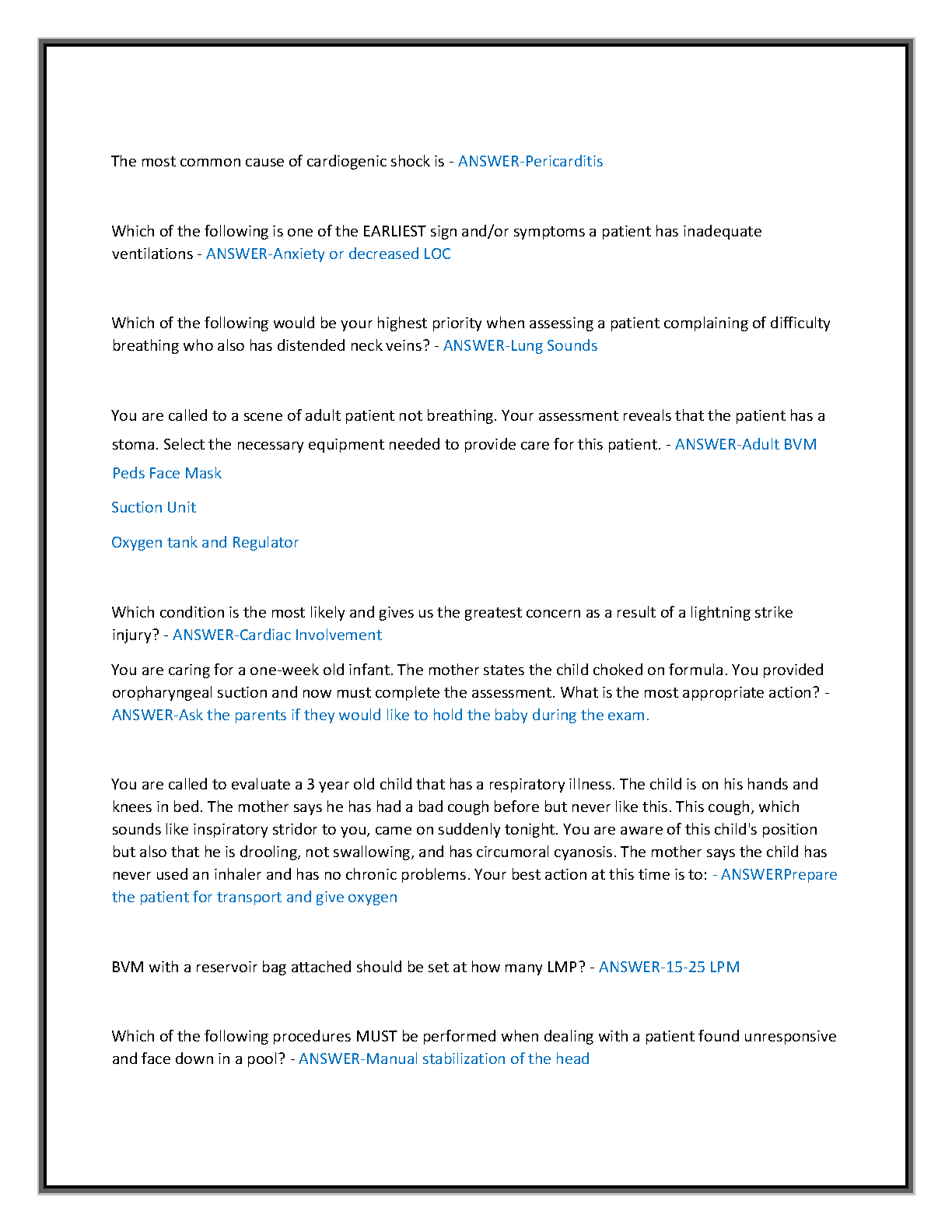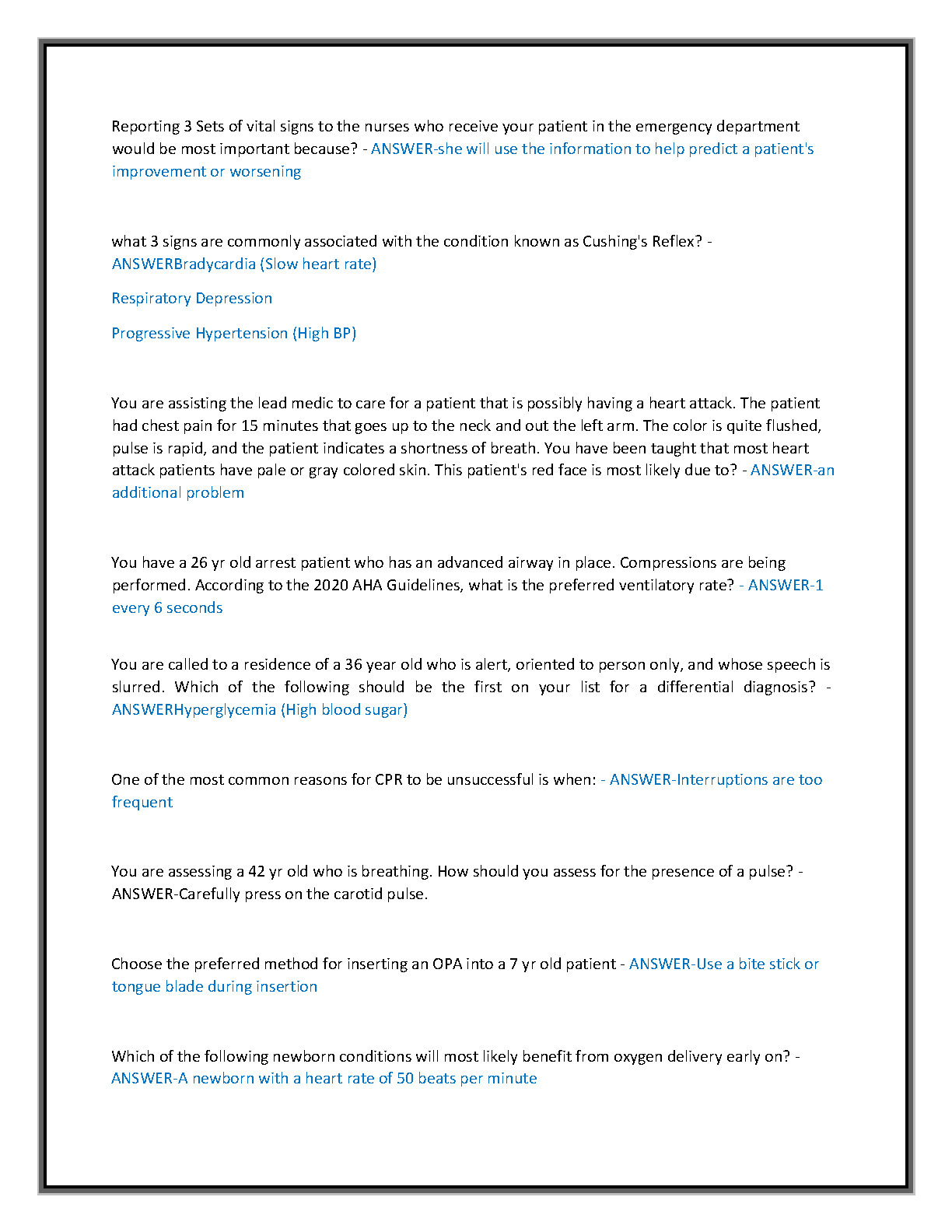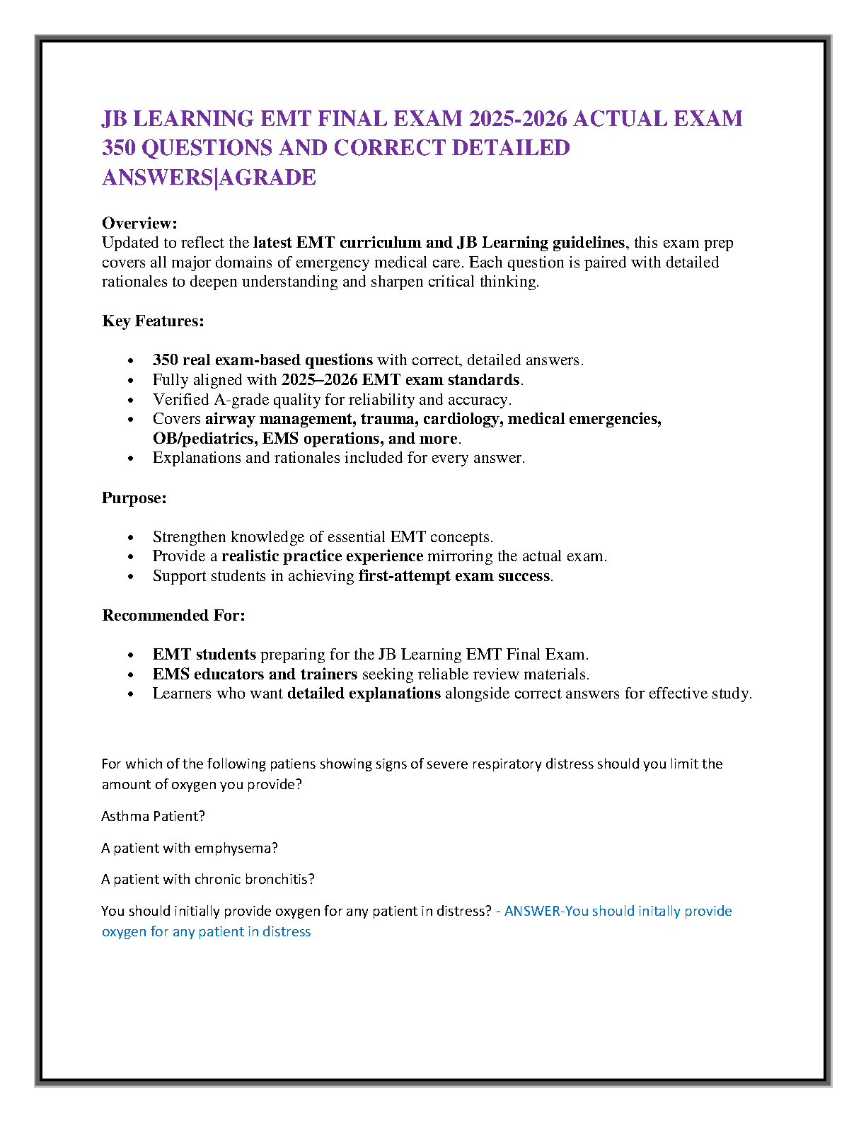 Master your JB Learning EMT Final Exam with this meticulously updated practice test bank, fully aligned with the 2025-2026 EMT curriculum and standards. Featuring over 350 realistic, exam-based questions, each accompanied by correct, detailed answers and in-depth rationales, this resource is engineered to ensure you pass your EMT certification exam on your very first attempt, effectively avoiding resits. Strengthen your understanding across all critical emergency medical care domains including airway management, trauma, cardiology, medical emergencies, OB/pediatrics, and EMS operations. This A-grade quality resource provides the essential realistic practice and critical thinking skills needed to excel.