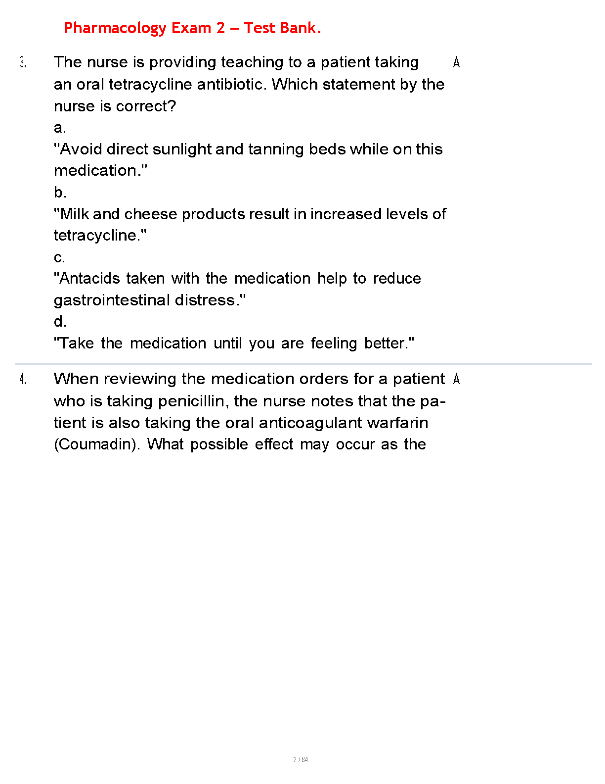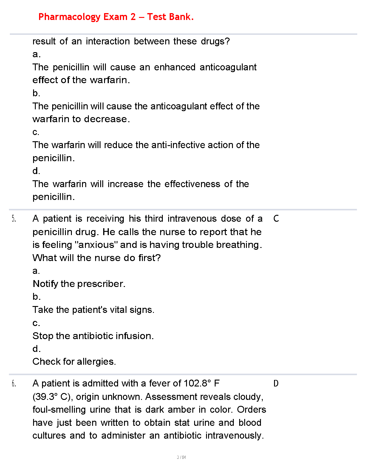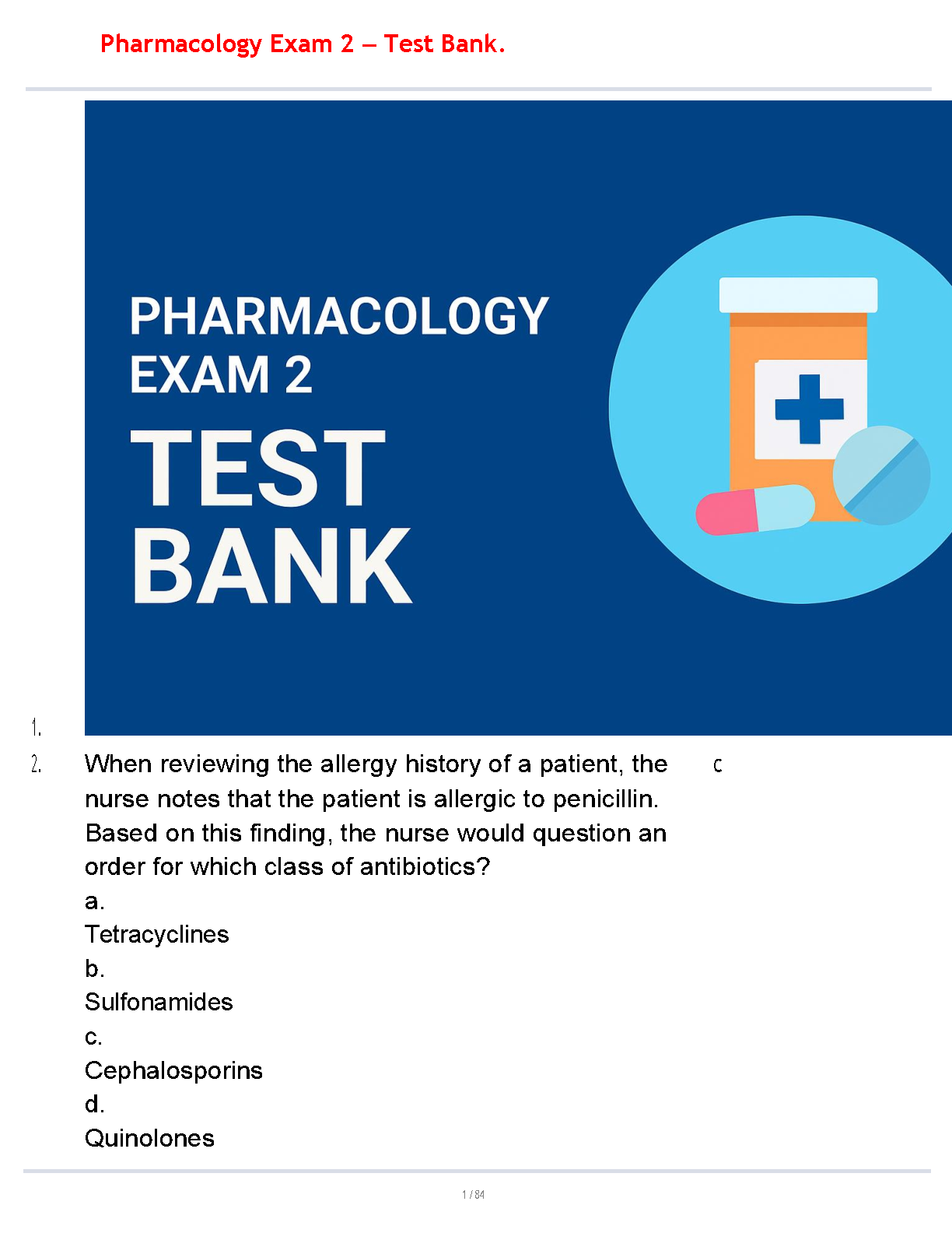 Master pharmacology with this comprehensive Test Bank for Exam 2, specifically designed for the 2025/2026 academic year. Featuring a wide range of challenging questions, including critical thinking scenarios like antibiotic allergies, this resource is your key to achieving first-time pass rates and avoiding resits. Strengthen your understanding and excel in your pharmacology studies.
