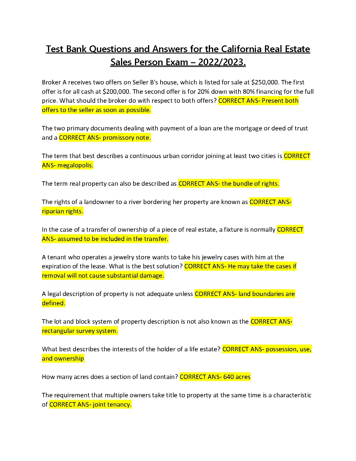 Test Bank Questions and Answers for the California Real Estate Sales Person Exam 2022/2023.. DOWNLOAD on www.hackedexams.com INSTANTLY.