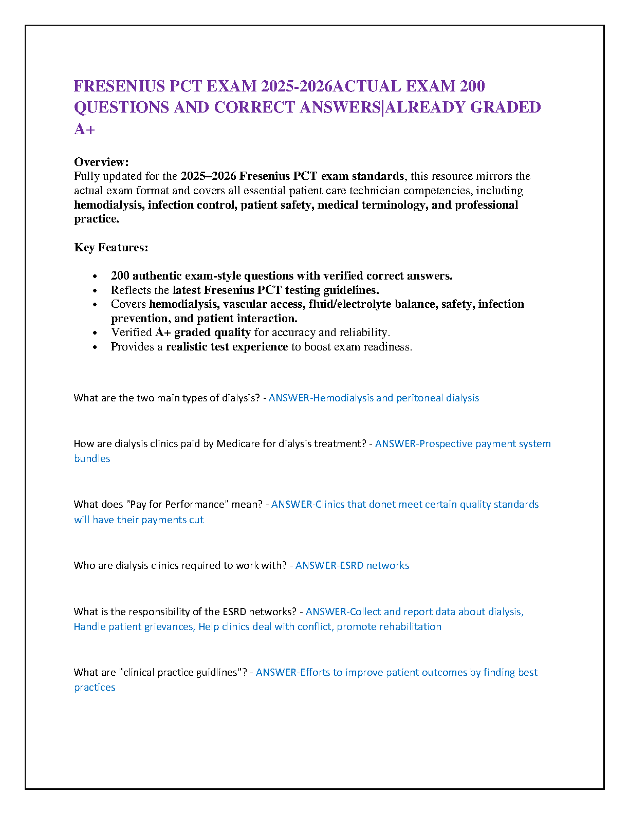 Prepare for your Fresenius PCT certification with this comprehensive resource, featuring 200 authentic exam-style questions and verified correct answers. This guide aligns with the latest 2025-2026 Fresenius PCT exam standards and covers all essential patient care technician competencies, including hemodialysis, vascular access, fluid/electrolyte balance, safety, infection prevention, and patient interaction. Get an A+ graded quality for accuracy and reliability, and gain a realistic test experience to boost your exam readiness and avoid resits.