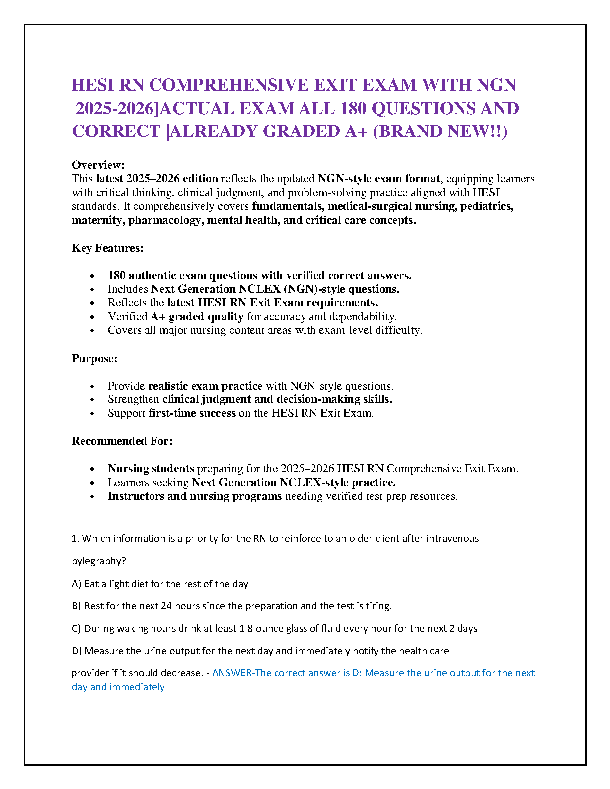 Prepare for your HESI RN Comprehensive Exit Exam with confidence using this brand-new 2025-2026 edition practice resource. Featuring 180 authentic, Next Generation NCLEX (NGN)-style questions complete with verified correct answers and A+ graded explanations, this essential study tool is designed for first-attempt success. It thoroughly covers all critical nursing domains including fundamentals, medical-surgical, pediatrics, maternity, pharmacology, mental health, and critical care, mirroring the latest HESI RN Exit Exam requirements to ensure you pass and avoid costly resits.