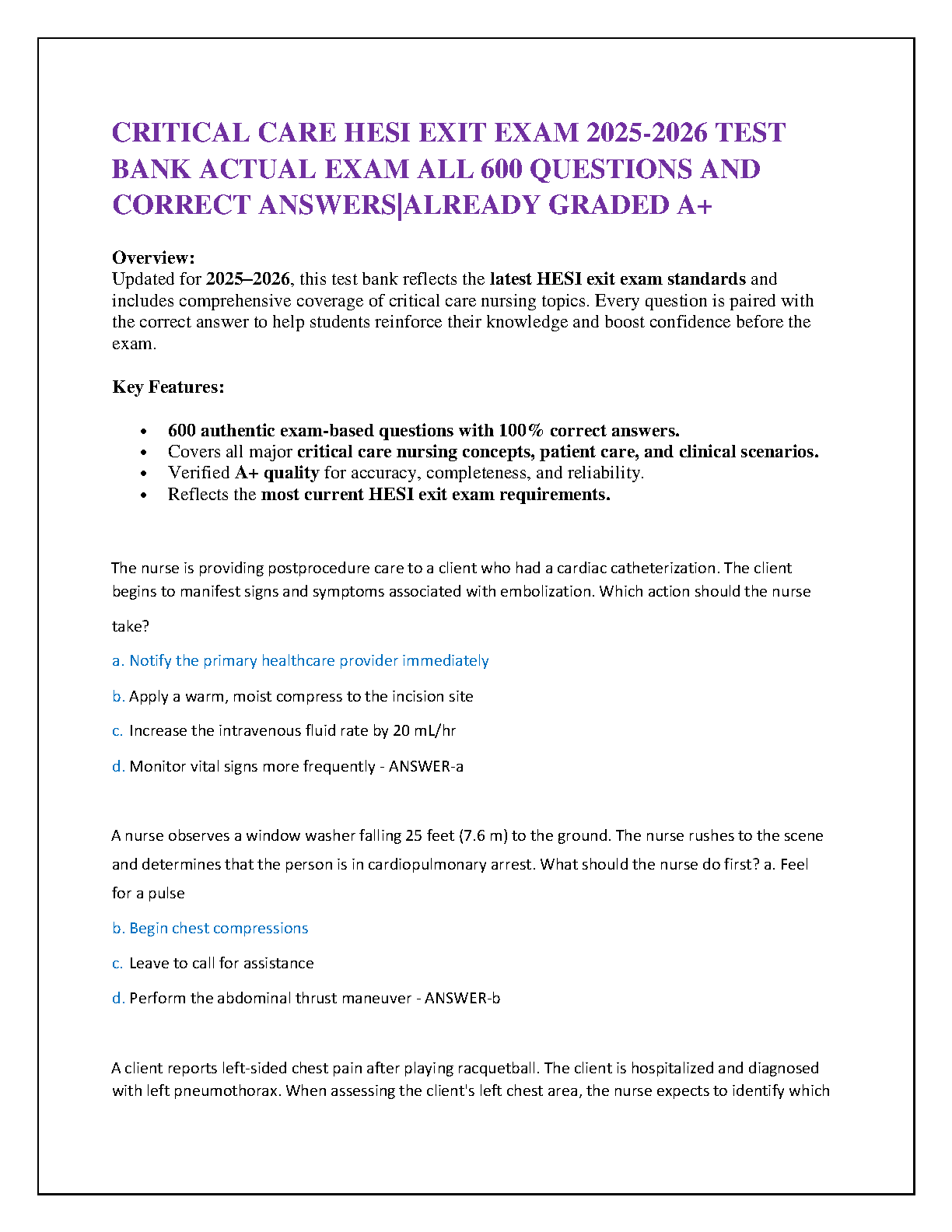 Prepare confidently for your 2025-2026 HESI Critical Care Exit Exam with this comprehensive test bank. Featuring over 600 authentic, exam-style questions meticulously paired with 100% verified A+ correct answers, this resource is designed to mirror the latest HESI exit exam standards. It provides in-depth coverage of essential critical care nursing concepts, patient care management, and realistic clinical scenarios. Boost your knowledge, build crucial confidence, and ensure you pass your HESI Critical Care Exit Exam on your very first attempt, avoiding costly resits. This test bank offers unparalleled accuracy and reliability to help you master challenging topics and achieve a top score.