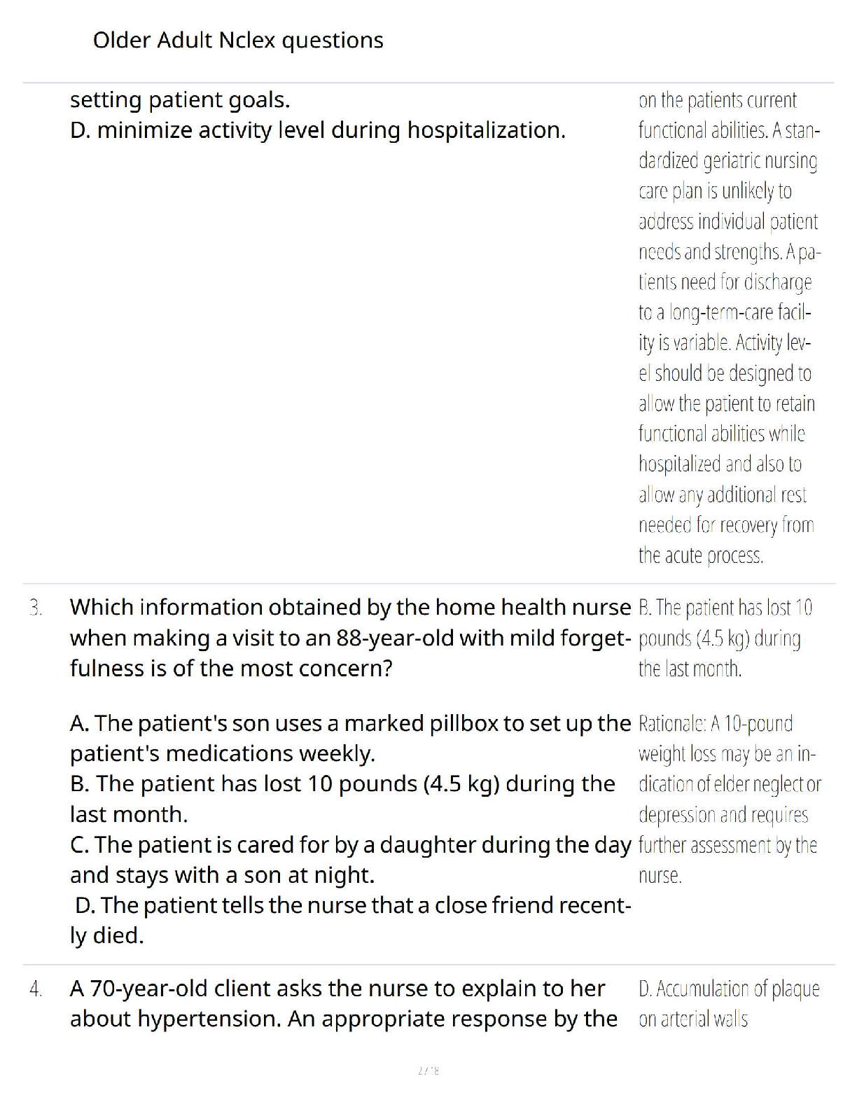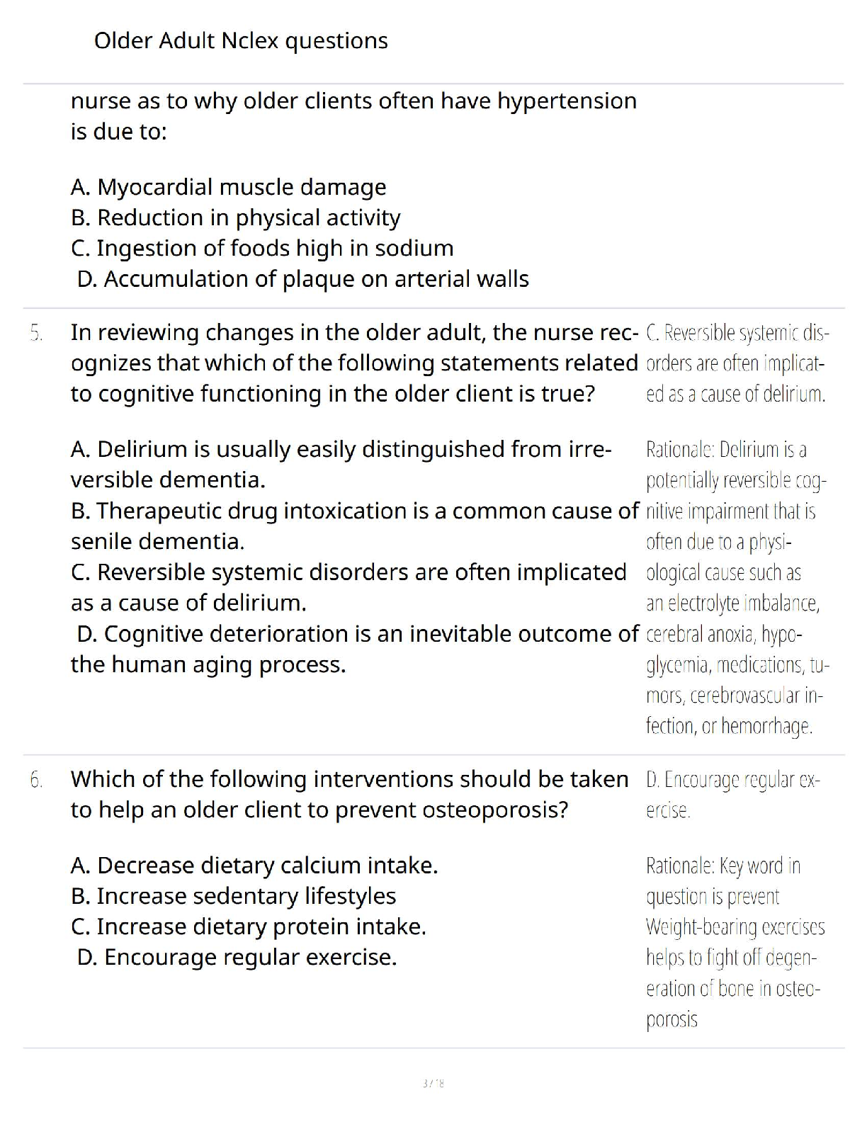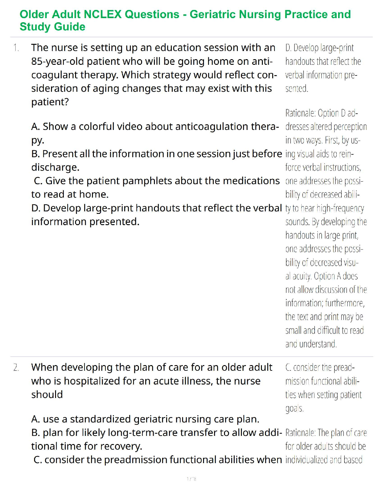 Unlock success on your NCLEX exam with this comprehensive Geriatric Nursing Practice Questions and Study Guide. Specifically designed for aspiring nurses, this resource offers challenging, realistic NCLEX-style questions focused on older adult care. Each question comes with in-depth rationales, allowing you to not only identify correct answers but also to understand the 'why' behind them, enhancing your critical thinking skills. Perfect for mastering essential concepts, avoiding common pitfalls, and ensuring you're fully prepared to pass the NCLEX on your first attempt and confidently provide expert care to older adults.
