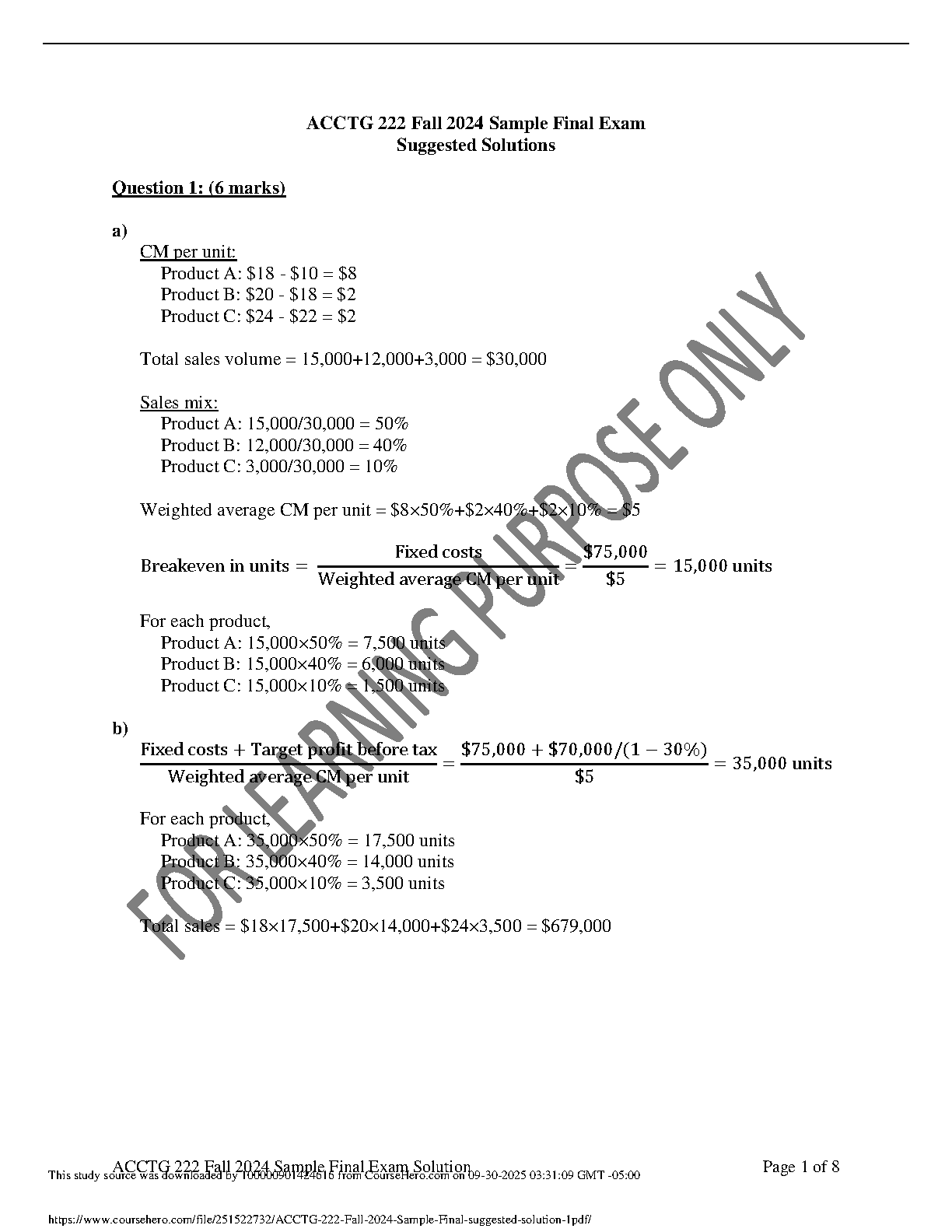 Prepare confidently for your ACCTG 222 Managerial Accounting final exam with this comprehensive solutions guide. Covering critical topics like CVP analysis, breakeven point determination, contribution margin, and target profit calculations, this Fall 2024 sample exam solution manual (aligned with concepts from authors like Garrison, Noreen, and Brewer) provides detailed, step-by-step explanations. Master complex problems, reinforce your understanding of essential accounting principles, and ensure you're fully prepared to pass your exams on the first attempt, saving time and avoiding costly resits.