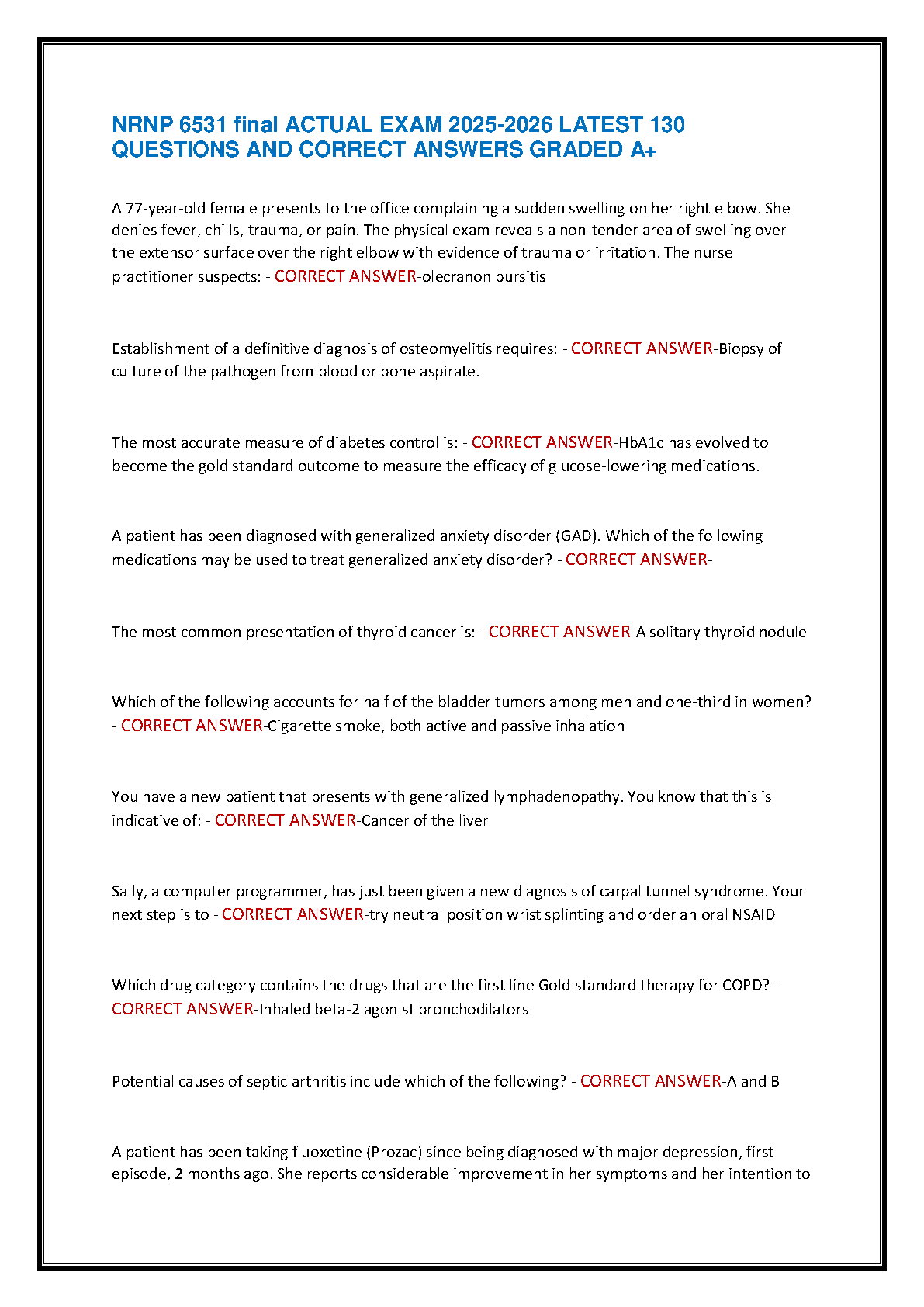 Master your NRNP 6531 final exam with this comprehensive 2025-2026 test bank! Featuring 130 actual exam-style questions and expertly graded A+ correct answers, this resource is meticulously designed to ensure you pass on your first attempt and avoid costly resits. Covering critical advanced practice nursing topics, it provides invaluable insights and practice opportunities to boost your confidence and understanding for the upcoming academic year. Perfect for students aiming for top grades and a solid grasp of advanced nursing concepts.