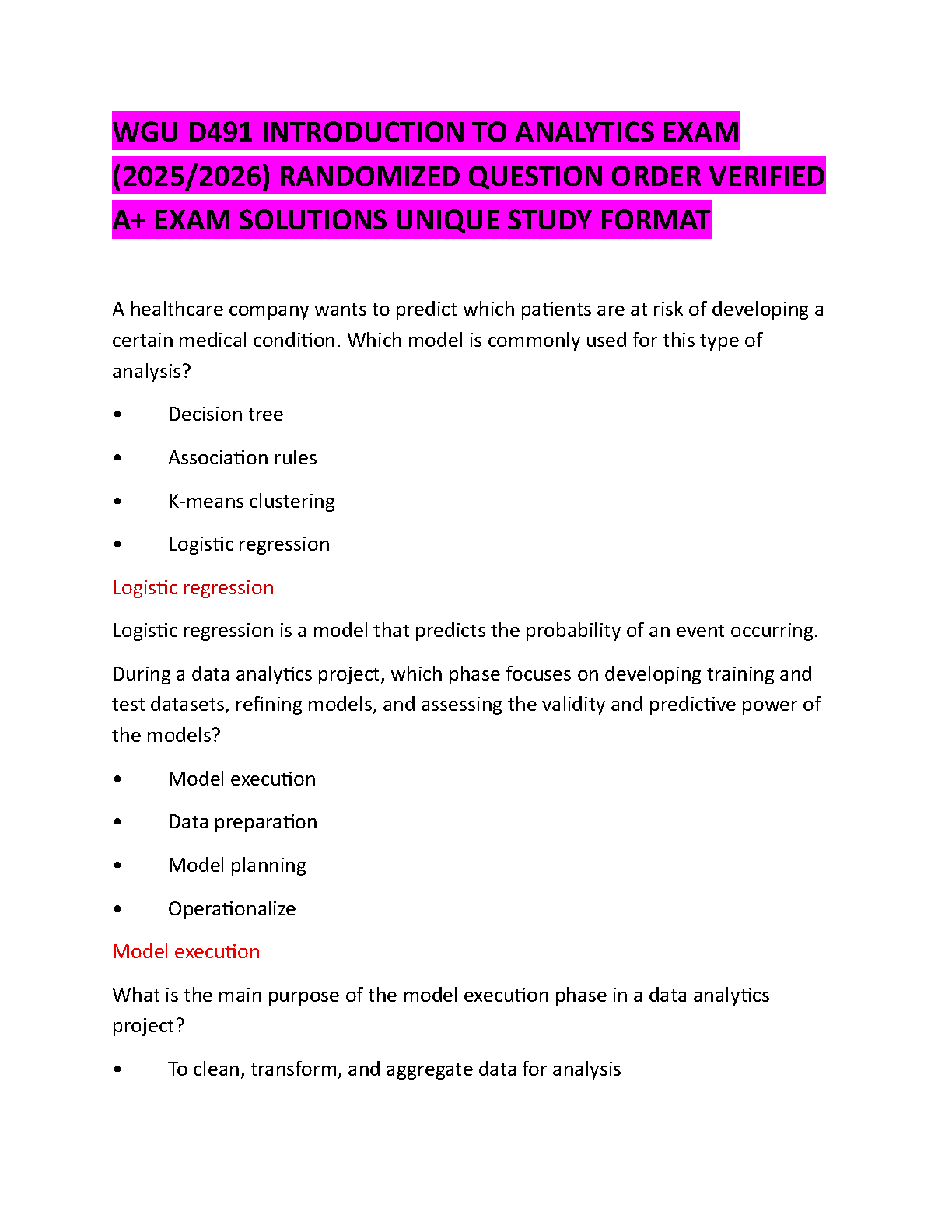 Unlock success in your WGU D491 Introduction to Analytics exam for the 2025/2026 academic year with this premium study resource. Designed to ensure you pass on your very first attempt and avoid costly resits, this guide features A+ verified exam solutions presented in a unique randomized question order. Systematically master crucial analytics concepts such as Logistic Regression, Decision Trees, K-means clustering, Association Rules, and the intricate phases of a data analytics project, including model execution, data preparation, and planning. Each question is paired with a comprehensive solution, providing profound clarity and strengthening your grasp of essential analytical methodologies. This is the ultimate tool for achieving an A+ in WGU D491 and securing your academic success.