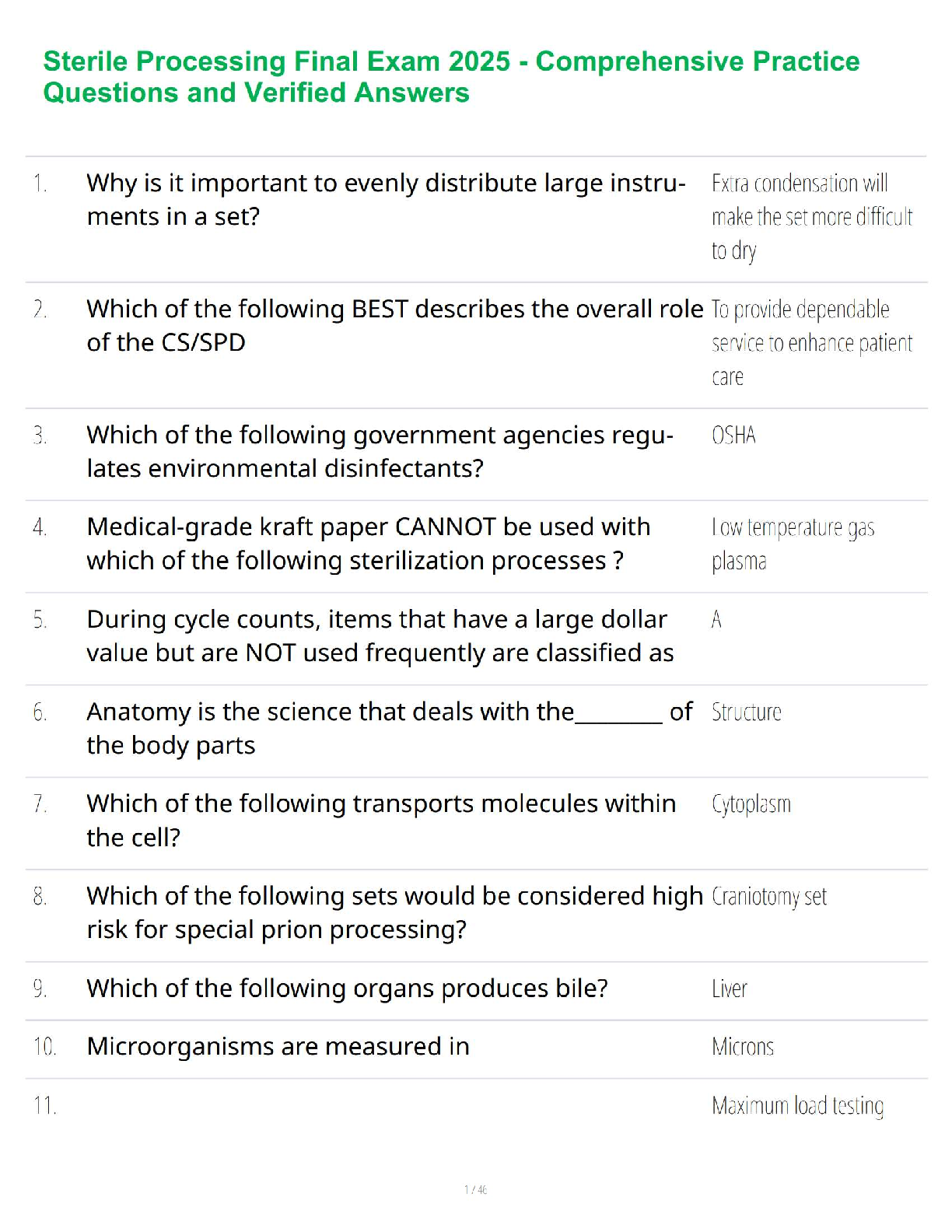 Prepare effectively for your Sterile Processing Certification Exam in the 2025/2026 academic year with this comprehensive test bank. Featuring a vast collection of practice questions and meticulously verified answers, this resource is engineered to ensure you master all critical concepts and achieve first-attempt success, helping you avoid costly and time-consuming resits. Topics include instrument management, regulatory standards, sterilization techniques, anatomy, and microbiology. An indispensable tool for serious exam preparation.