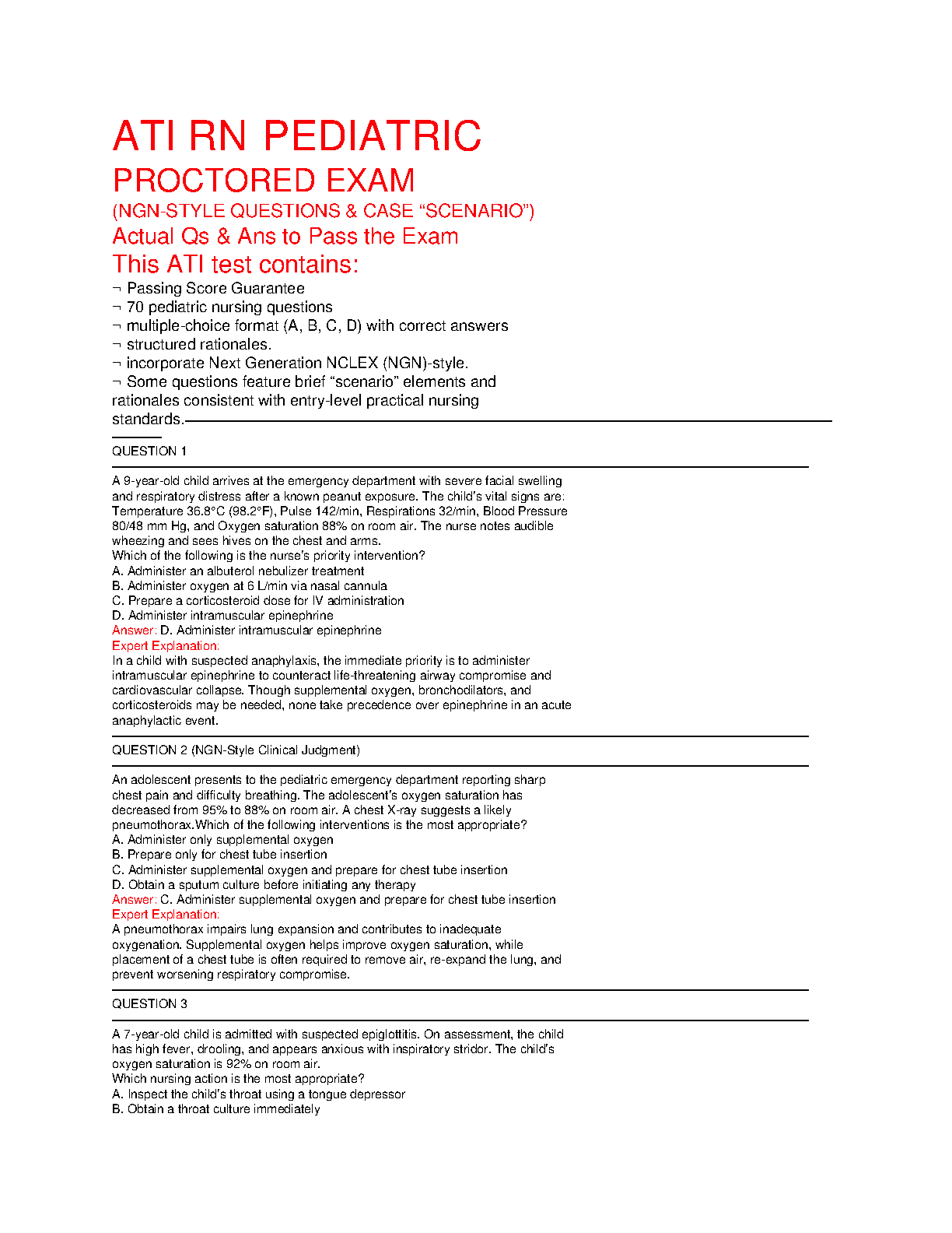 Master the ATI RN Pediatric Proctored Exam with this comprehensive 2025/2026 Test Bank, meticulously developed by ATI Nursing Education. This invaluable resource features 70 high-yield, Next Generation NCLEX (NGN)-style questions, complete with accurate answers and detailed, structured rationales. Designed to enhance your critical thinking and clinical judgment skills, this test bank effectively prepares you for complex pediatric nursing scenarios. Utilize this guide to confidently navigate your proctored exam, secure a passing score on your first attempt, and avoid costly resits. Each question closely mirrors the actual exam format and difficulty, ensuring you're fully equipped for success.