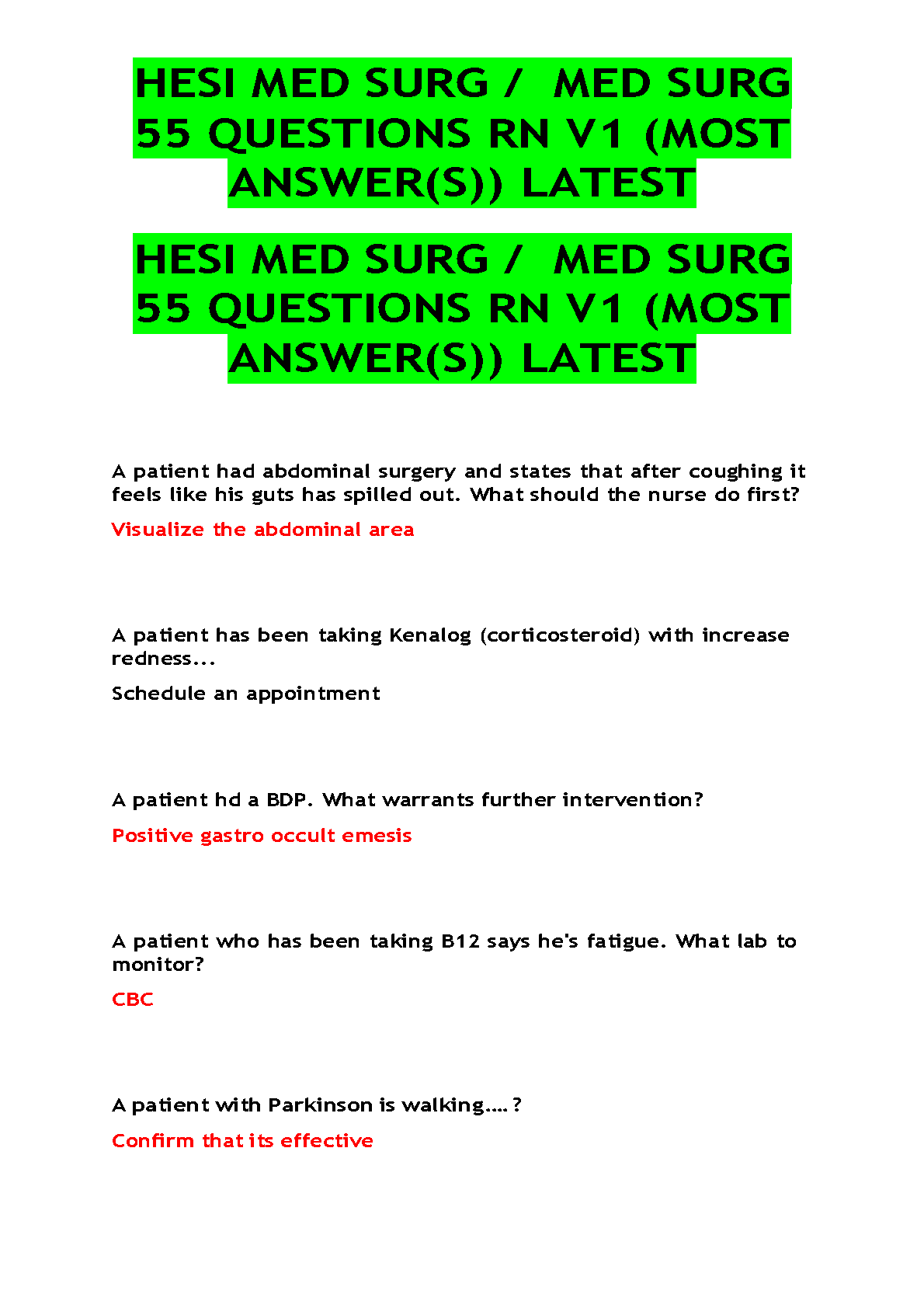 HESI Medical-Surgical RN Exam Test Bank 2025/2026 - Version 1 (V1) with 55 Practice Questions & Answers for First Attempt Pass