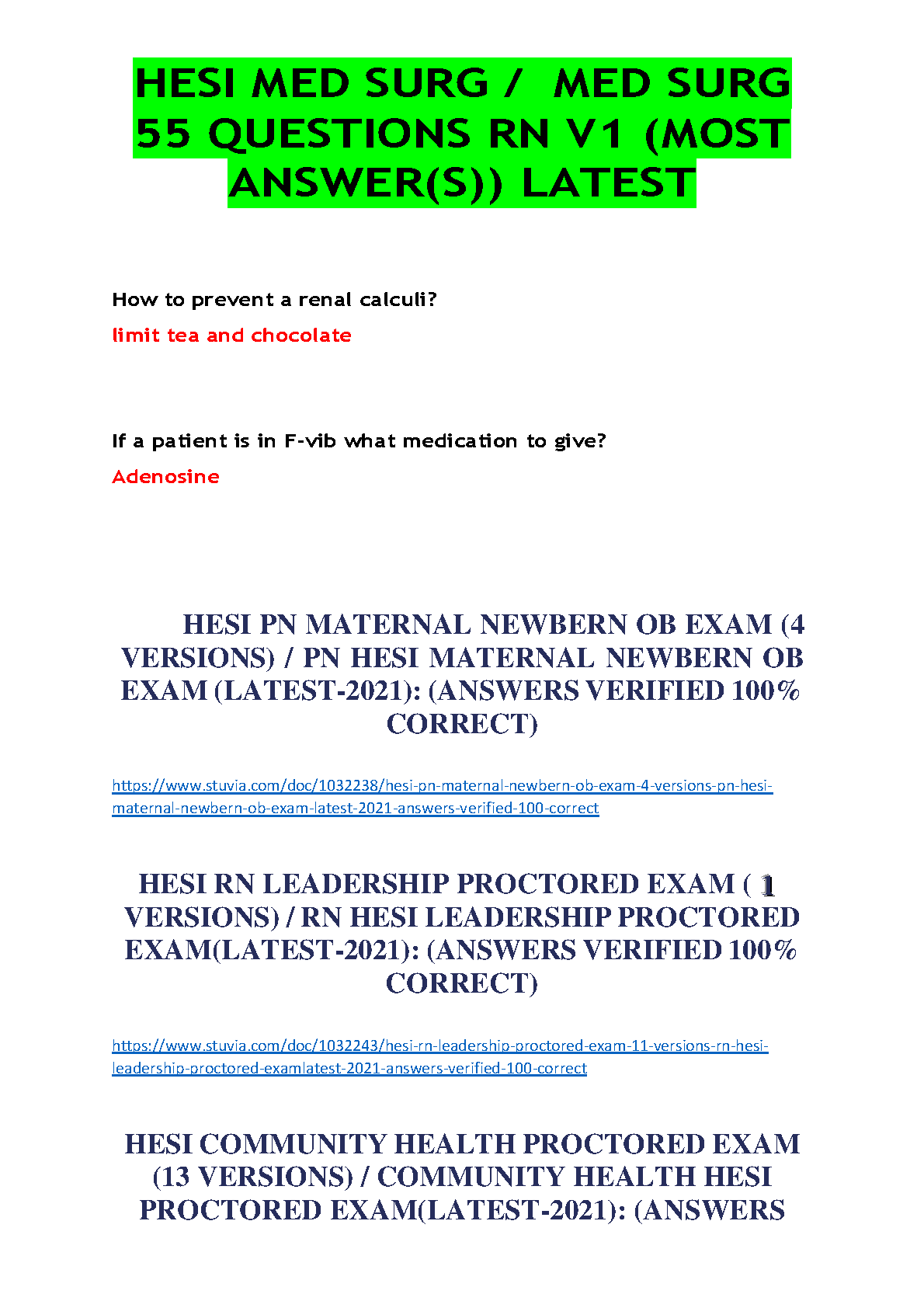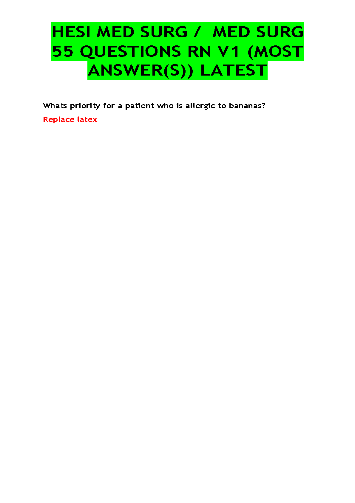 Ace your HESI Medical-Surgical RN exam with this comprehensive Test Bank for the 2025/2026 academic year. Featuring 55 critical practice questions and their most probable answers from Version 1 (V1), this resource is meticulously designed to sharpen your critical thinking and ensure you pass your exam on the very first attempt, avoiding costly resits. Prepare effectively with up-to-date content tailored for nursing students aiming for top scores in Med Surg.