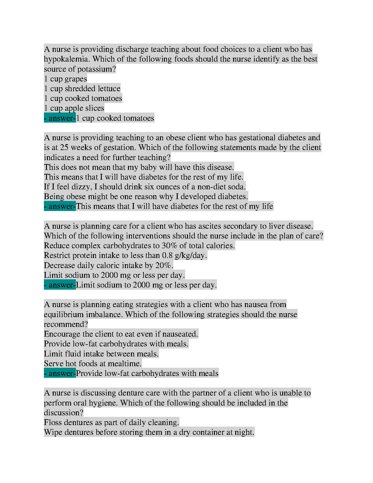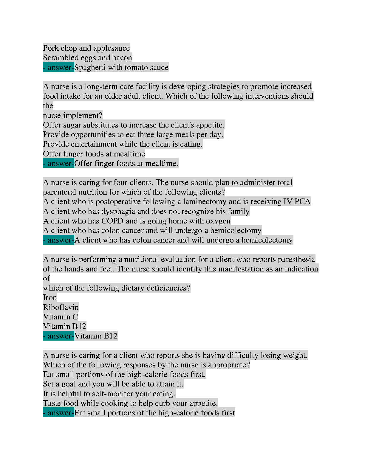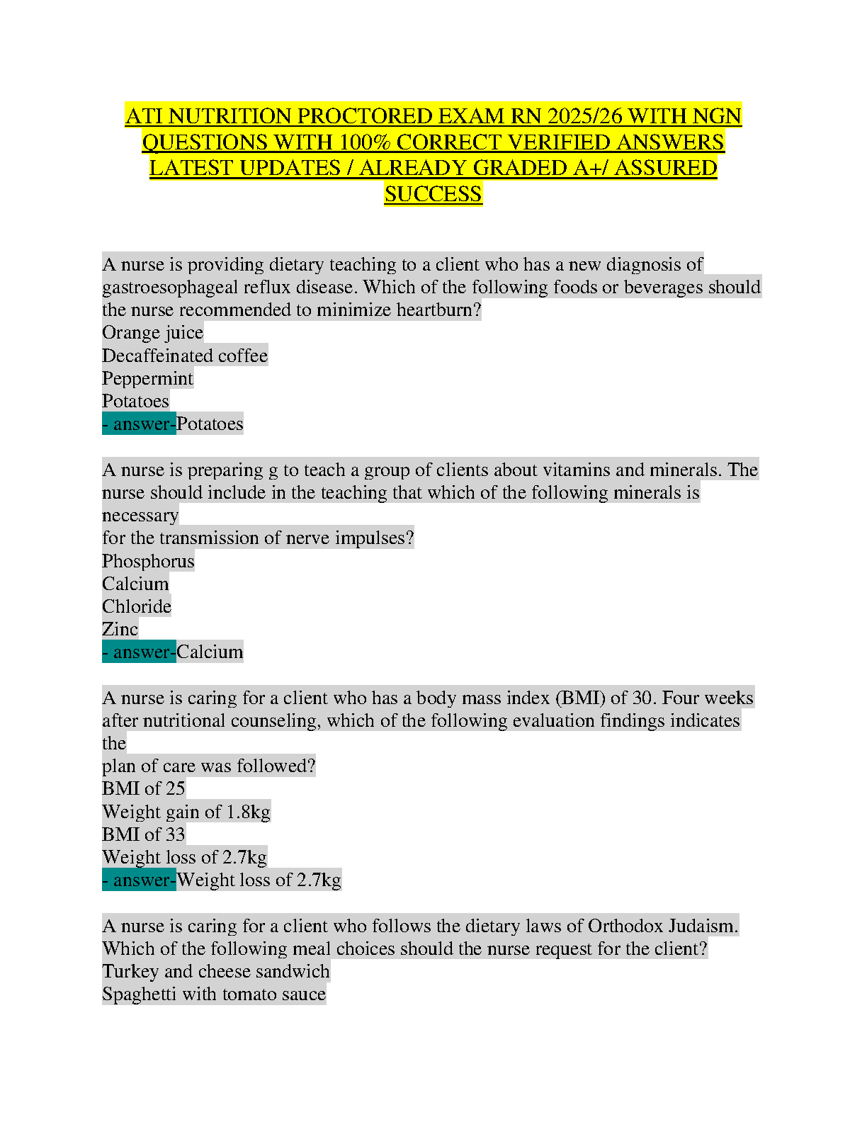 Ace your ATI Nutrition Proctored Exam with this comprehensive resource designed for the 2025/2026 academic year. Featuring Next Generation (NGN) style questions, this guide includes 100% correct, verified answers and explanations to ensure you pass your exam on the first attempt, avoiding resits. Master essential nutrition concepts and clinical judgment skills to achieve your best score.