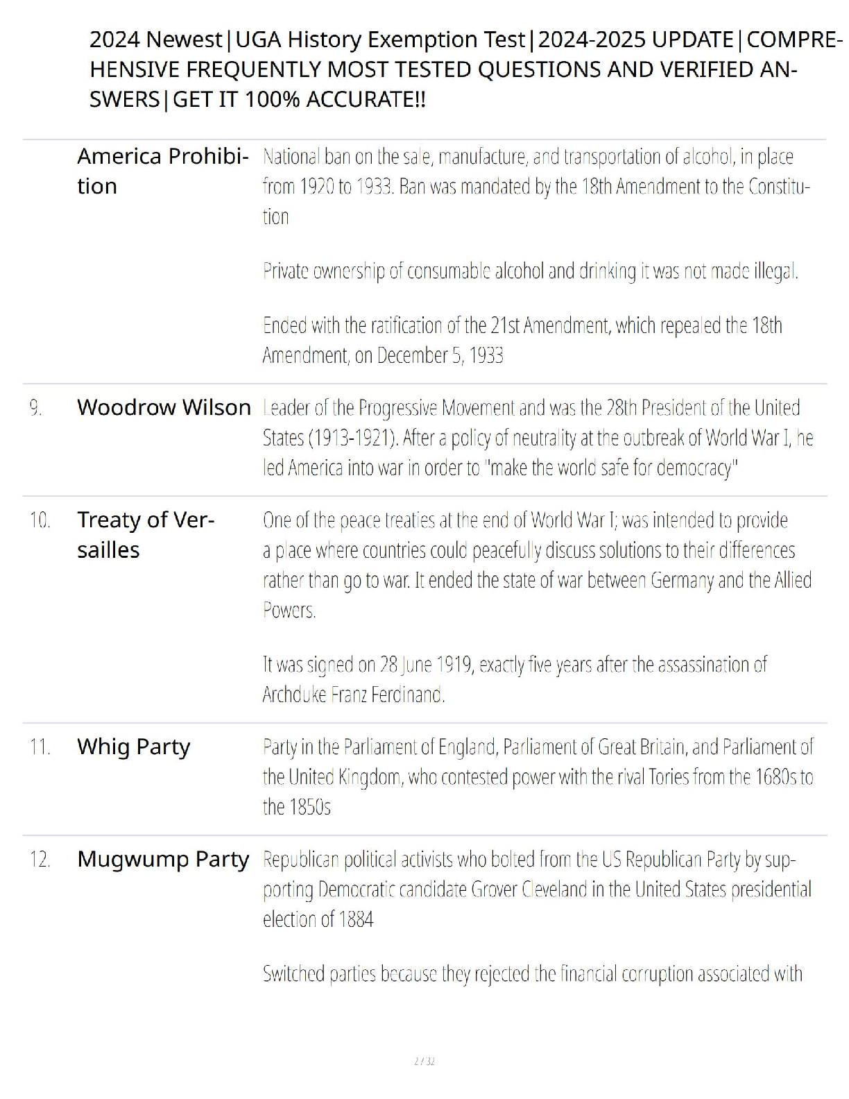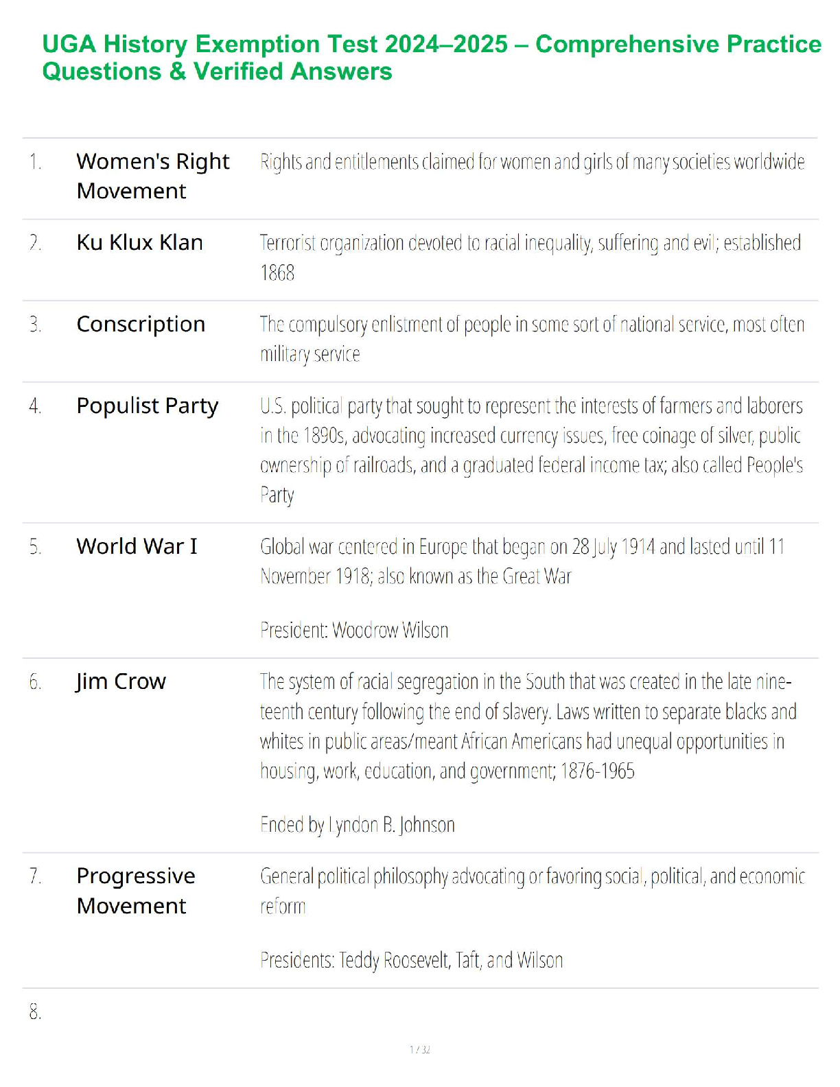 Prepare effectively for your UGA History Exemption Test 2024-2025 with this extensive practice resource. Featuring a wide range of comprehensive questions and verified answers, this study guide covers crucial historical topics such as the Women's Rights Movement, Populist Party, World War I, Jim Crow, and the Progressive Movement. Designed to bolster your understanding and boost your confidence, this material ensures you're fully equipped to pass your exemption exam on the first attempt and avoid resits.