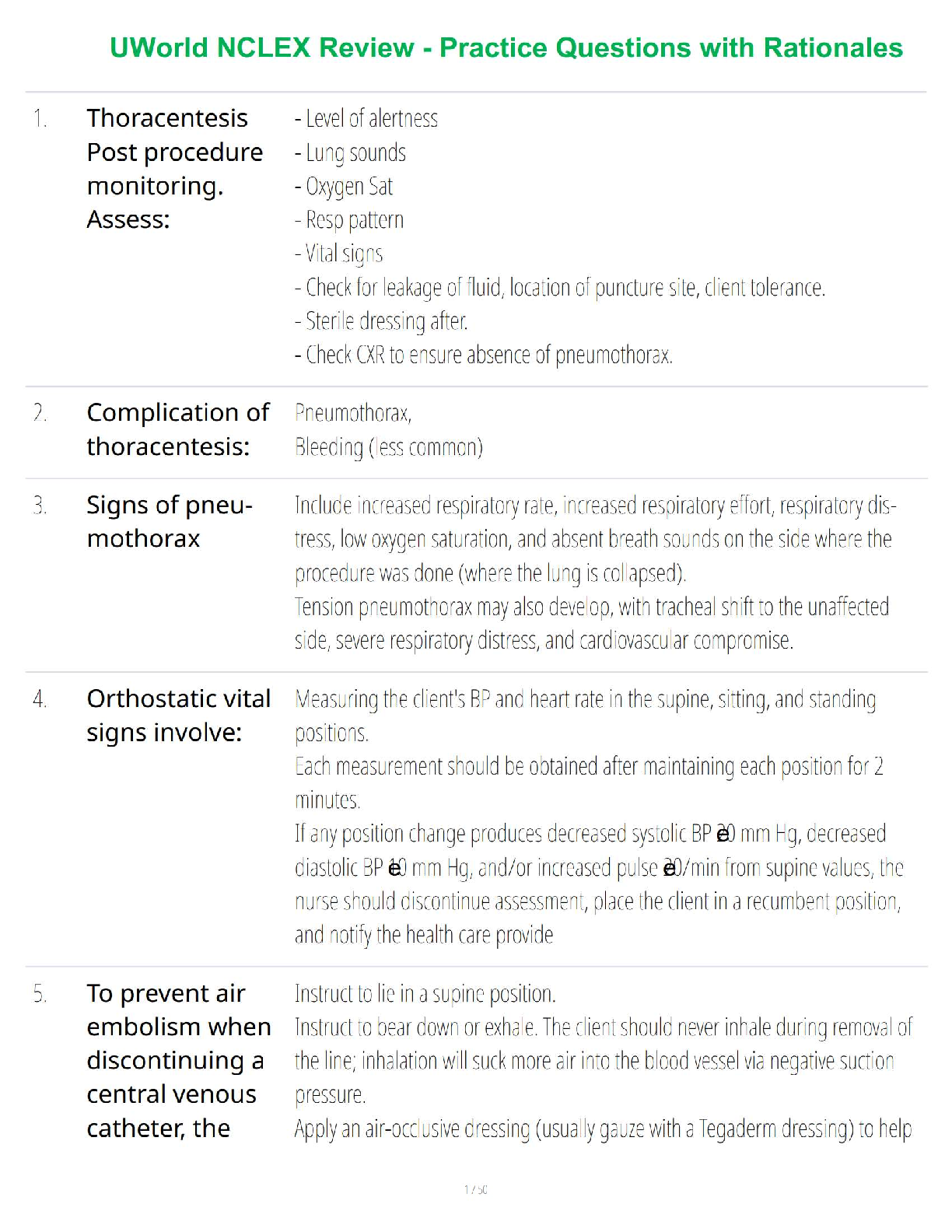 Master the NCLEX with this comprehensive review featuring crucial practice questions and detailed rationales. Designed to help nursing students excel and avoid resits, this resource covers key topics including thoracentesis procedures, complications, pneumothorax signs, orthostatic vital signs, and air embolism prevention. Equip yourself with the knowledge needed to pass your exams on the first attempt.