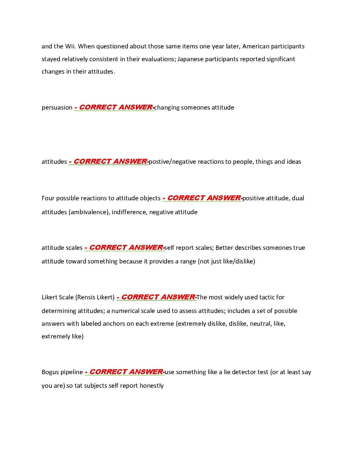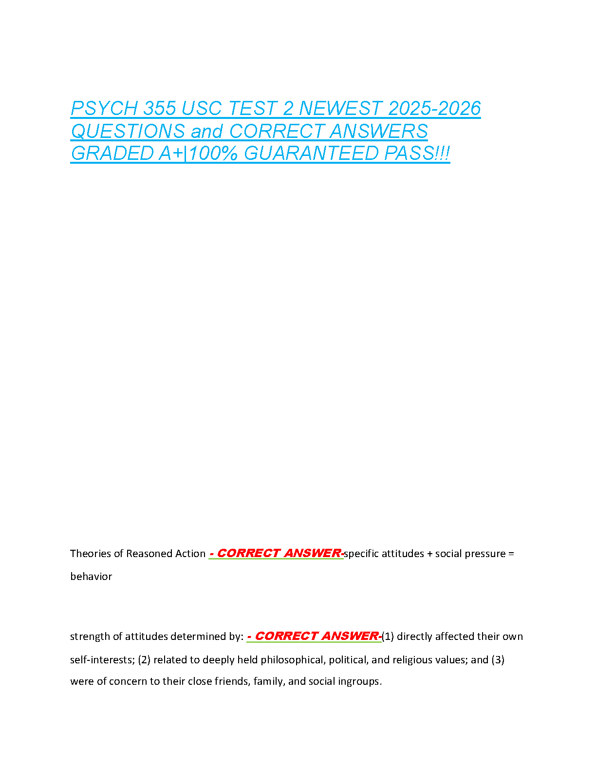 Prepare effectively for your PSYCH 355 Social Psychology Test 2 at USC with this comprehensive and up-to-date exam bank for the 2025-2026 academic year. This essential resource features the newest questions and meticulously verified correct answers, ensuring you understand key concepts like the Theories of Reasoned Action and the determinants of attitude strength. Designed to help you ace your exams on the first attempt, secure an A+ grade, and confidently avoid costly resits. Ideal for students aiming for top marks in their USC Social Psychology course, mirroring content from leading textbooks such as 'Social Psychology' by Aronson, Wilson, Akert, and Sommers.