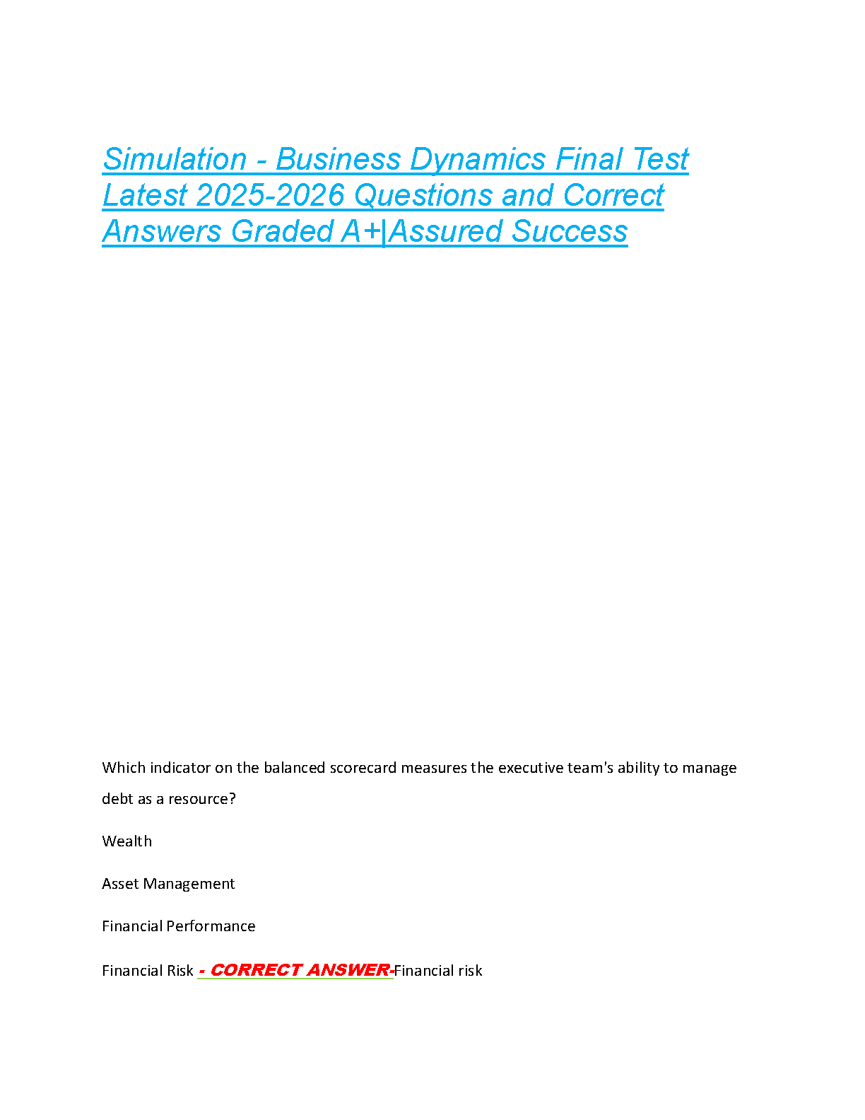 Master your 'Business Dynamics Simulation' final exam with this premium test bank, packed with the latest 2025-2026 questions and meticulously verified A+ graded answers. This essential resource is designed to help students confidently pass their exams on the first attempt and avoid costly resits, by thoroughly covering critical concepts rooted in leading Business Dynamics principles, including those foundational to John D. Sterman's seminal 1st Edition work. Each practice question, such as 'Which indicator on the balanced scorecard measures the executive team's ability to manage debt as a resource?', is accompanied by a clear, correct solution (e.g., Financial risk). Prepare effectively, boost your understanding, and achieve an A+ grade with this ultimate study companion for guaranteed exam success.