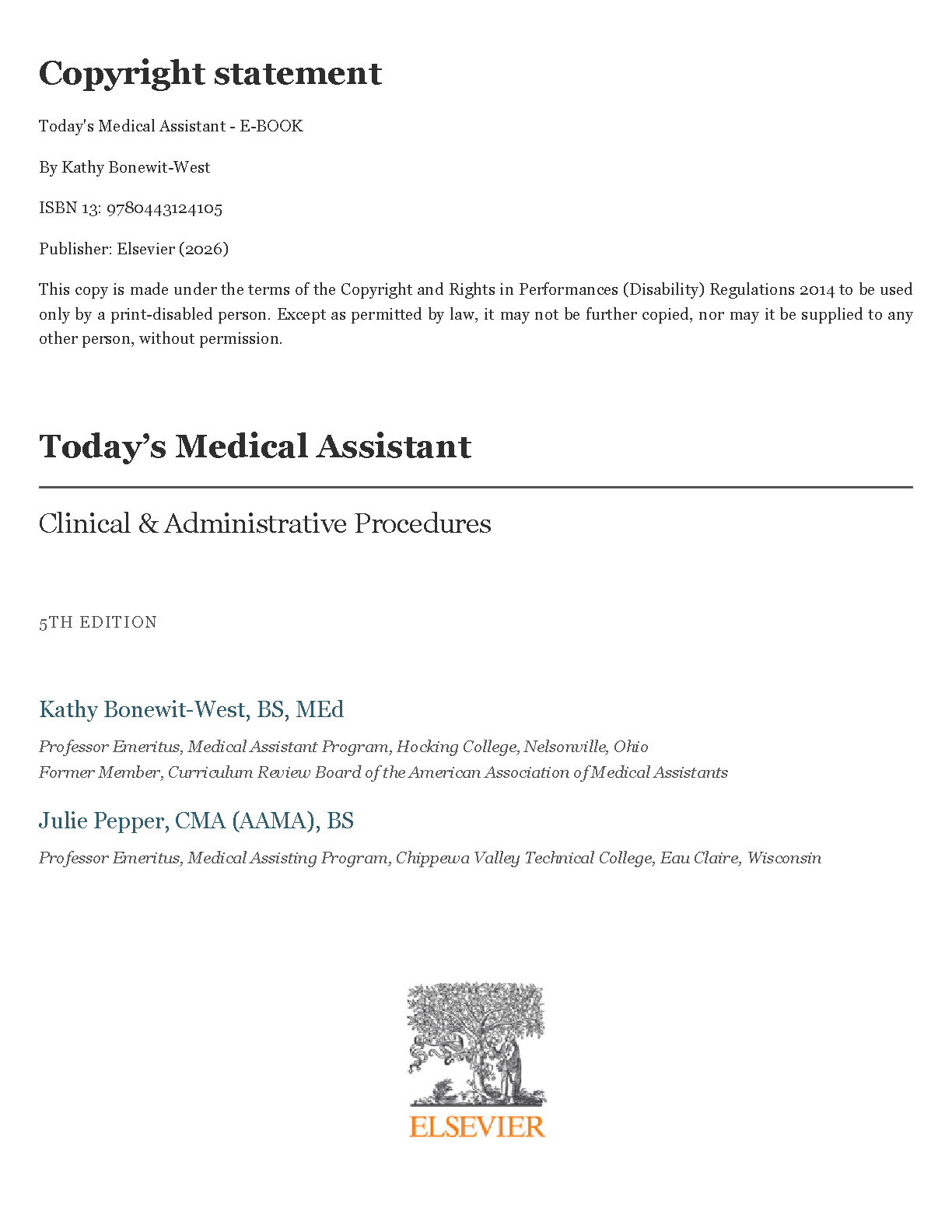 Master all the essential clinical and administrative procedures for medical assisting with the 5th Edition of 'Today's Medical Assistant'. Authored by Kathy Bonewit-West and Julie Pepper, this comprehensive resource is designed to equip students with the knowledge and skills needed to excel in their exams and avoid resits for the 2025/2026 academic year. Packed with practical insights and up-to-date information, it's your key to first-attempt success.