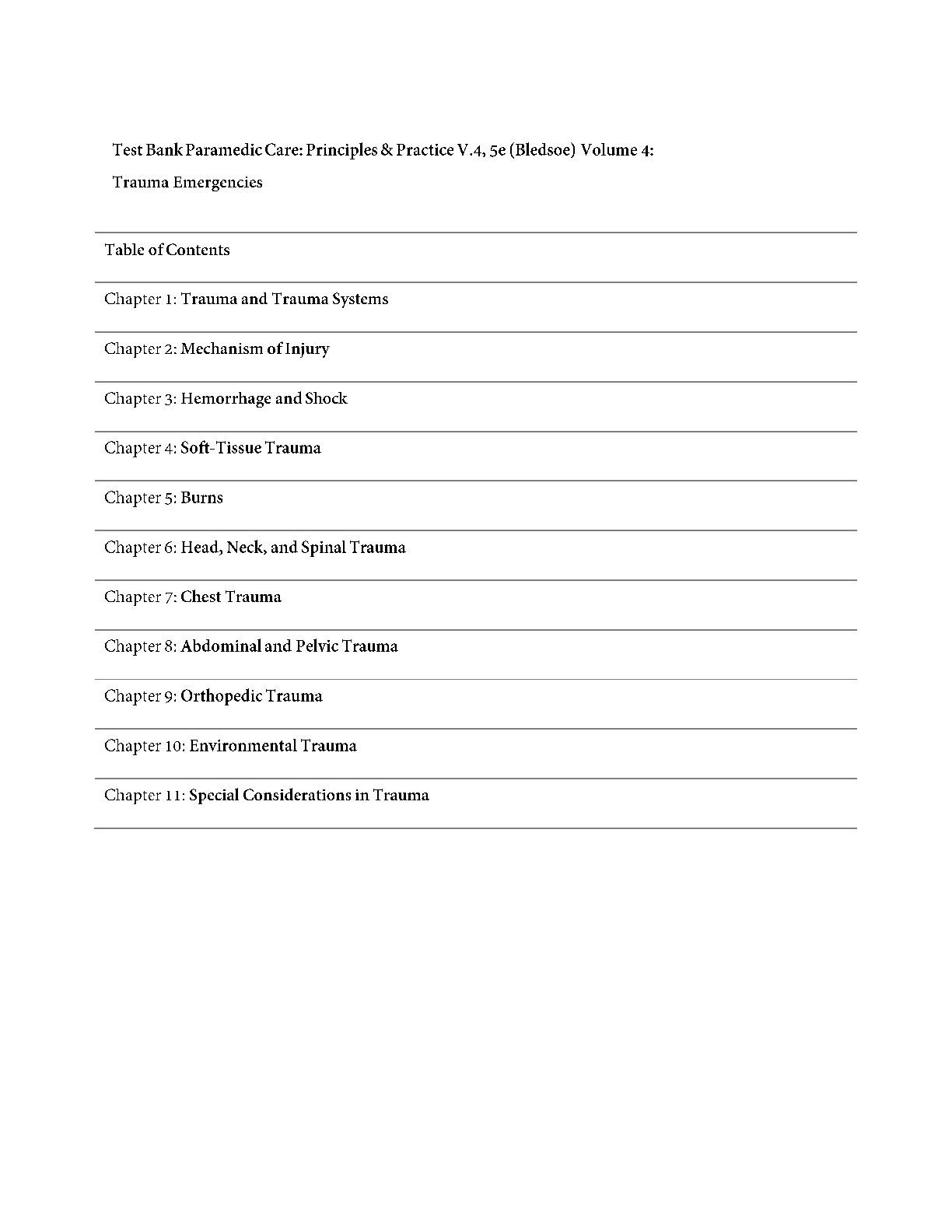 Unlock your full potential and master trauma emergency concepts with this comprehensive Test Bank for Paramedic Care: Principles & Practice, Volume 4, 5th Edition. Authored by Bryan E. Bledsoe, Robert S. Porter, and Richard A. Cherry, this indispensable resource provides an extensive collection of exam-style questions and detailed answers. Specifically designed for the 2025/2026 academic year, it's your ultimate tool to prepare effectively, understand critical concepts, and confidently pass your paramedic certification exams on the first attempt, ensuring you avoid costly resits. Dive deep into trauma care principles and practice with this latest, updated edition to secure your success.