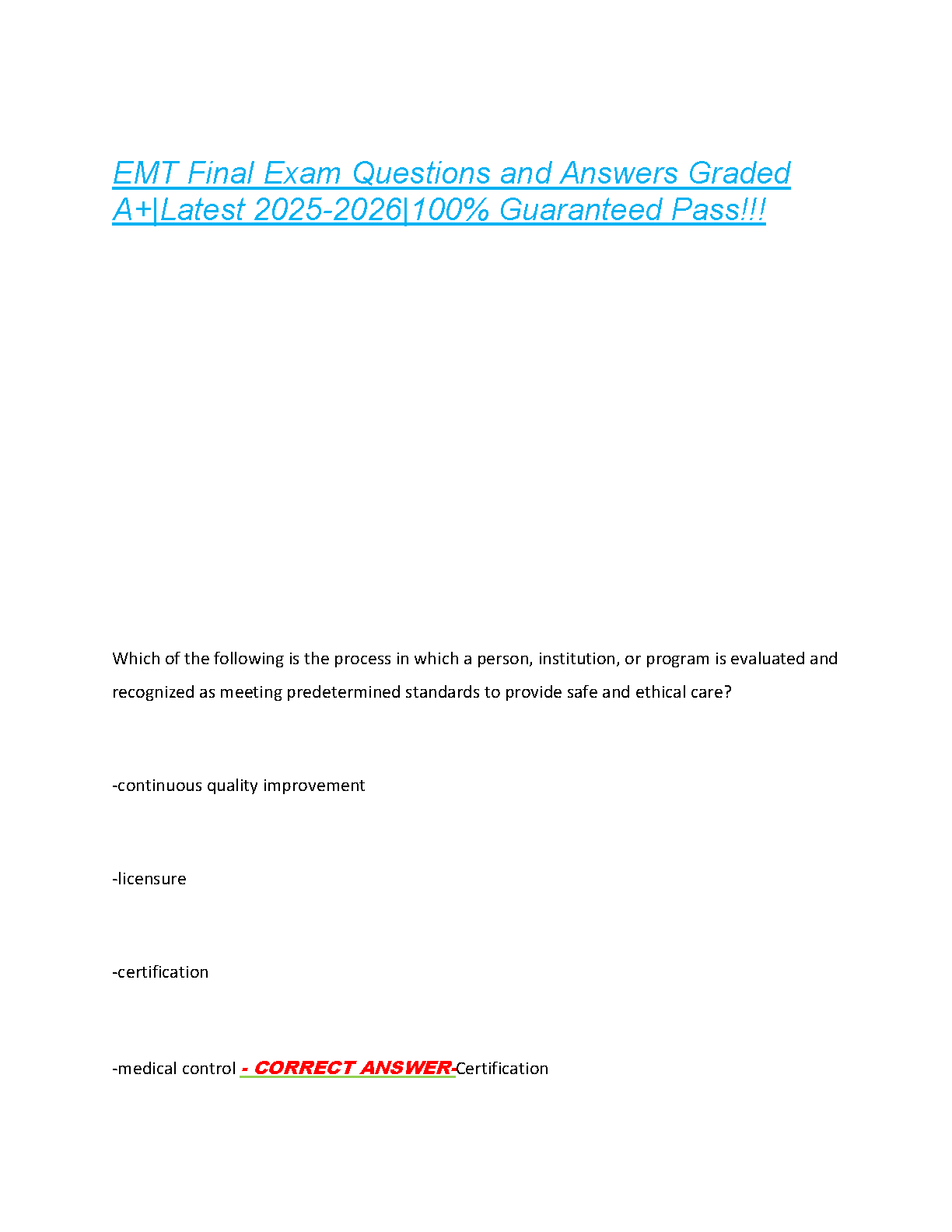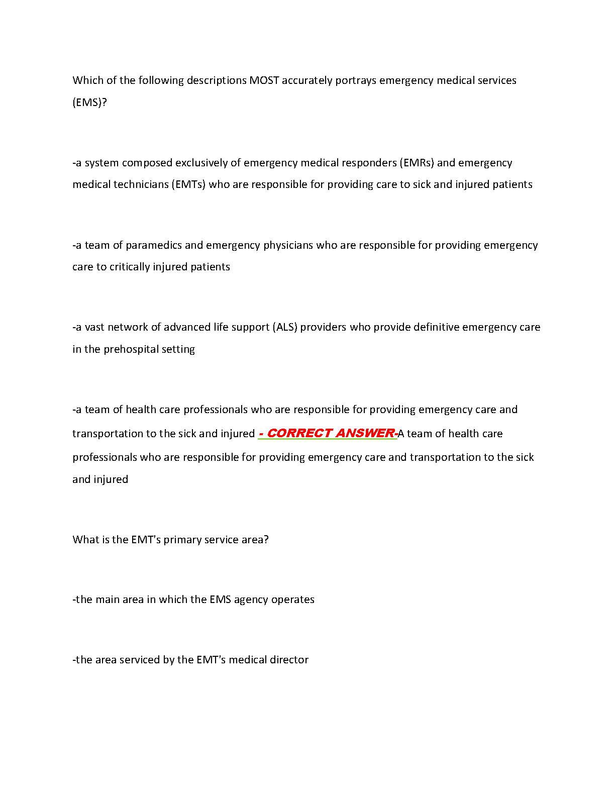 Prepare comprehensively for your EMT Final Exam with this updated test bank for the 2025-2026 academic year. Featuring a wide range of practice questions and detailed answers, this resource is meticulously designed to ensure you master essential emergency medical technician concepts. Boost your confidence, aim for an A+ grade, and pass your EMT certification exam on your first attempt, saving you time and effort from retakes. Understand critical topics, including patient assessment, medical emergencies, trauma care, and ethical standards, as demonstrated by the sample question.