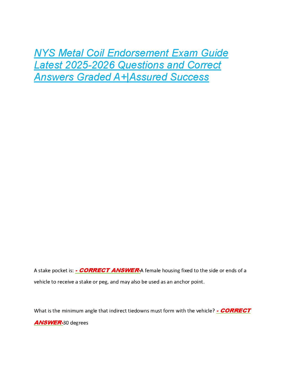 Prepare confidently for your NYS Metal Coil Endorsement Exam with this comprehensive 2025-2026 Test Bank. Designed to ensure you pass on your first attempt and avoid costly resits, this guide features the latest exam-style questions and meticulously verified correct answers. Master crucial topics like stake pockets, indirect tiedown regulations, and secure loadment practices. Achieve an A+ grade with this essential study resource, providing the critical knowledge and practice needed for assured success in the upcoming academic year.