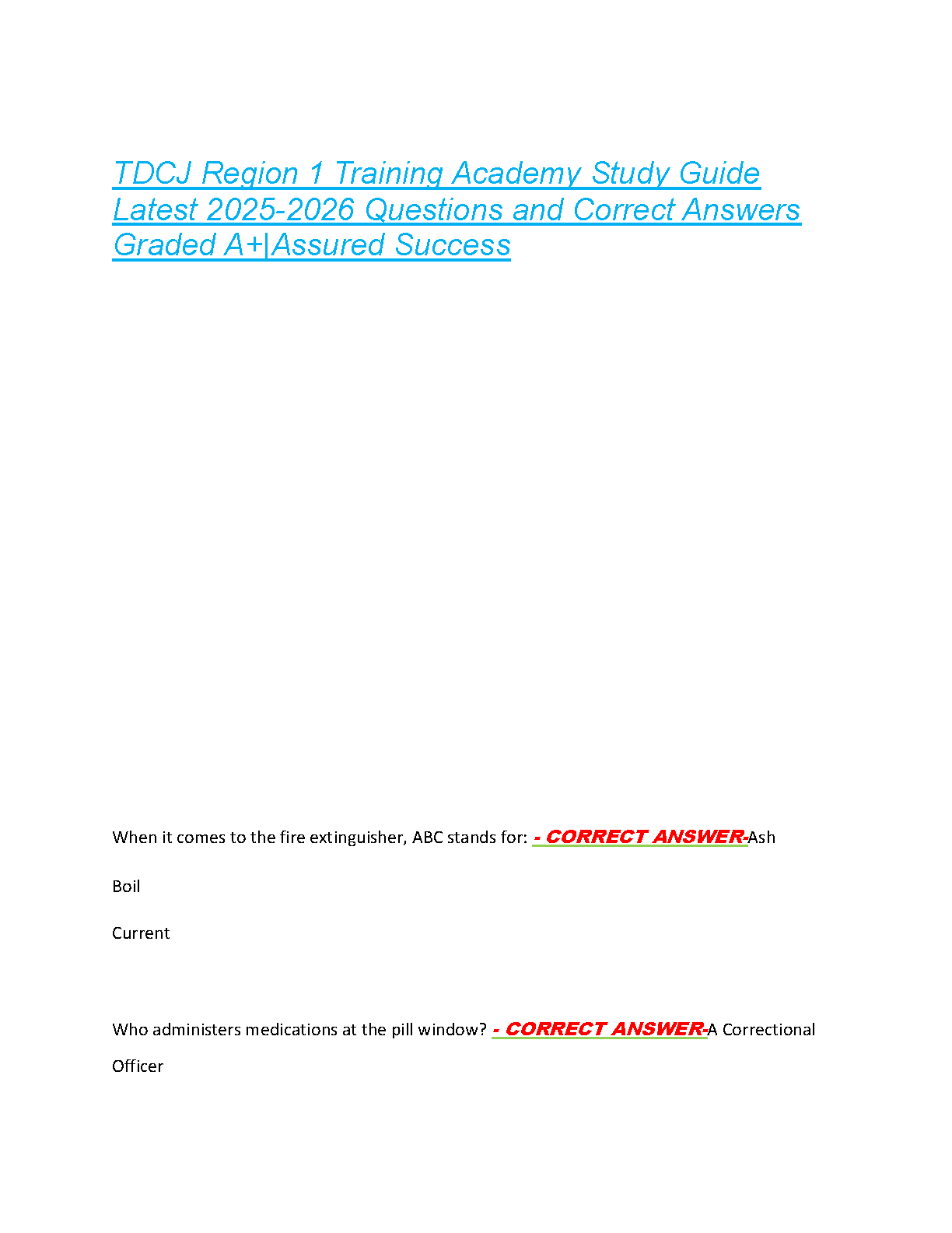 TDCJ Region 1 Training Academy Study Guide: Latest 2025-2026 Questions & Answers for First-Attempt Exam Success