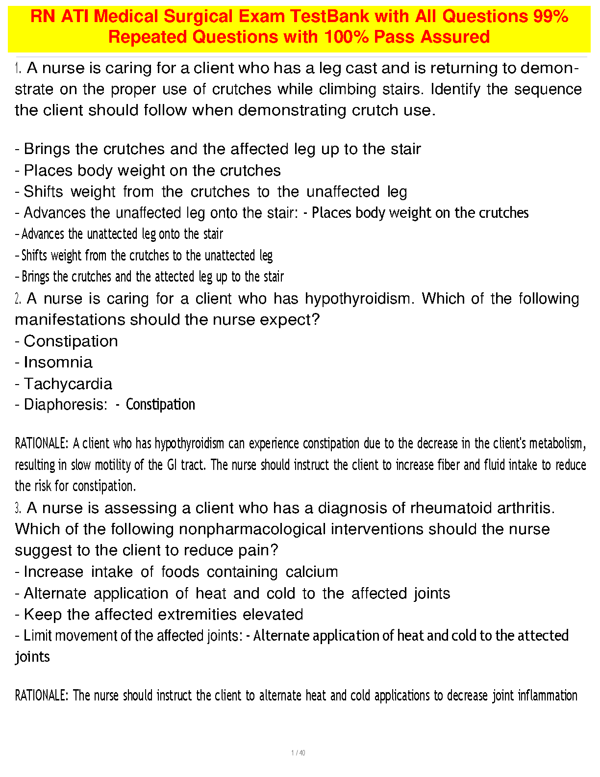 Unlock your potential for first-attempt success on the ATI RN Medical-Surgical exam with this extensive test bank. Featuring a wide array of meticulously crafted practice questions and detailed rationales, this resource is engineered to enhance your understanding of key medical-surgical concepts. Prepare confidently with content designed to reflect actual exam patterns, ensuring you master critical nursing judgment and clinical reasoning skills to achieve a guaranteed pass.