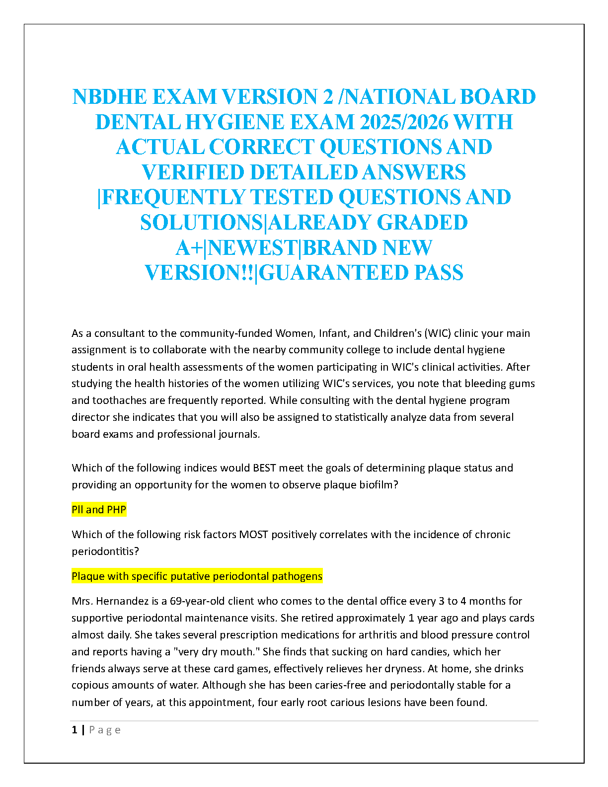 Prepare comprehensively for the National Board Dental Hygiene Exam (NBDHE) 2025/2026 with this Brand New Version 2 Test Bank. Featuring actual correct questions, verified detailed answers, and frequently tested scenarios, this A+ graded resource is designed to ensure you pass your NBDHE on the first attempt, avoiding costly resits. Master essential dental hygiene concepts through meticulously crafted questions and clear, concise solutions, including practical case studies like the WIC clinic assignment. This invaluable study tool guarantees a deep understanding of exam topics and boosts your confidence for exam day, making it the most appropriate resource to help students avoid resits.