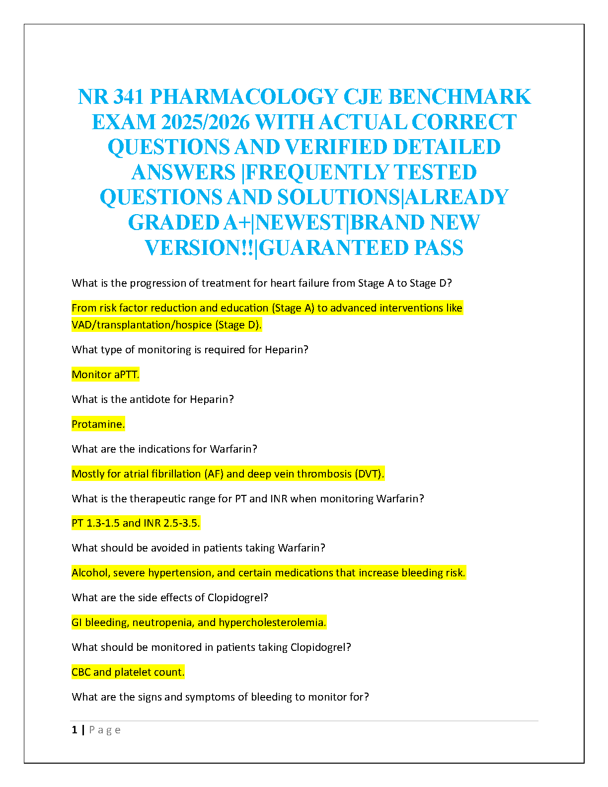 Ace your NR 341 Pharmacology CJE Benchmark Exam with our updated 2025/2026 edition. This resource provides actual correct questions, verified detailed answers, and frequently tested concepts. Master the material and ensure a guaranteed first-time pass, avoiding resits.