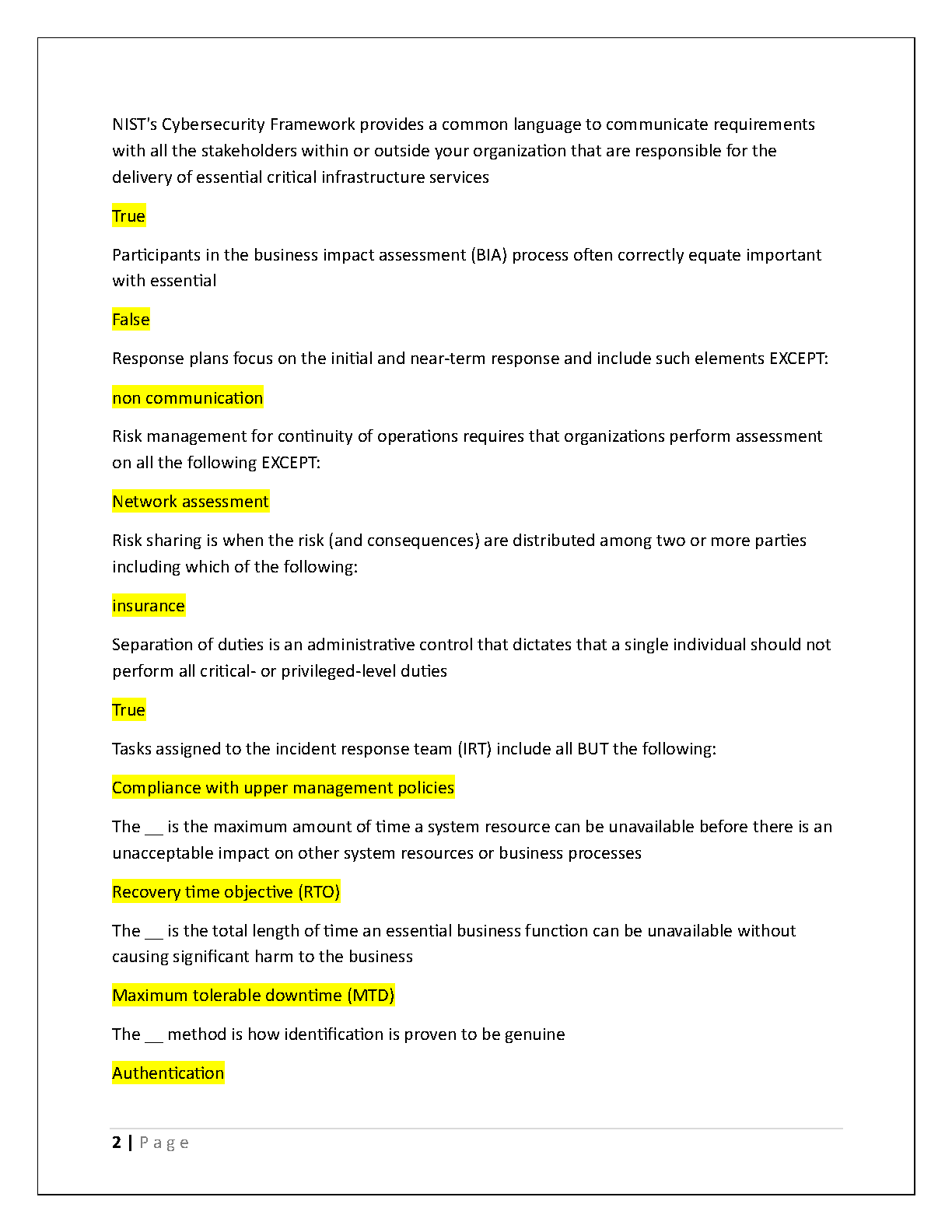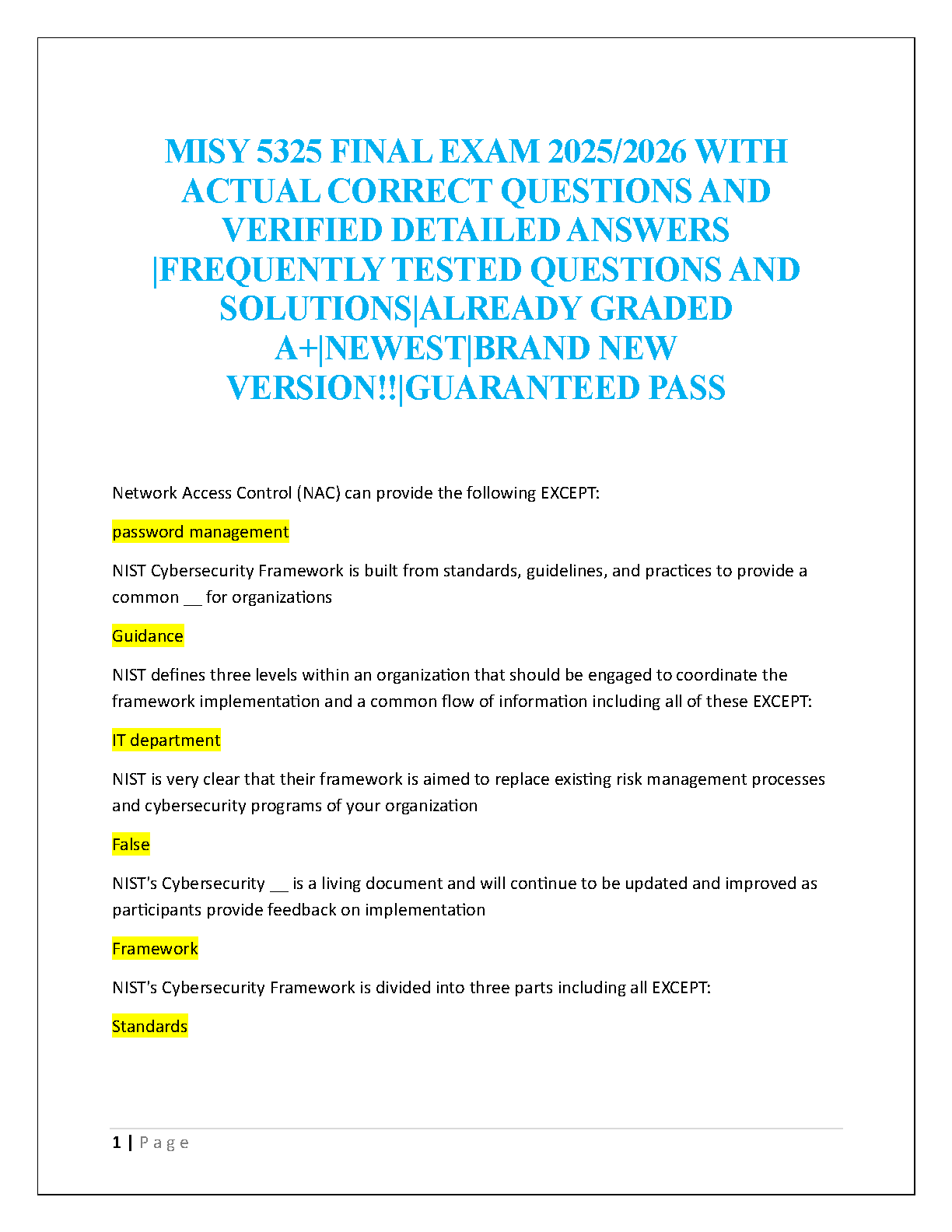 Prepare for your MISY 5325 Final Exam with this comprehensive resource featuring actual, correct questions and verified detailed answers. This study guide is designed to cover frequently tested topics, ensuring you achieve an A+ and pass on your first attempt. Avoid resits with this brand new version, covering essential cybersecurity concepts like Network Access Control (NAC) and NIST Cybersecurity Framework.