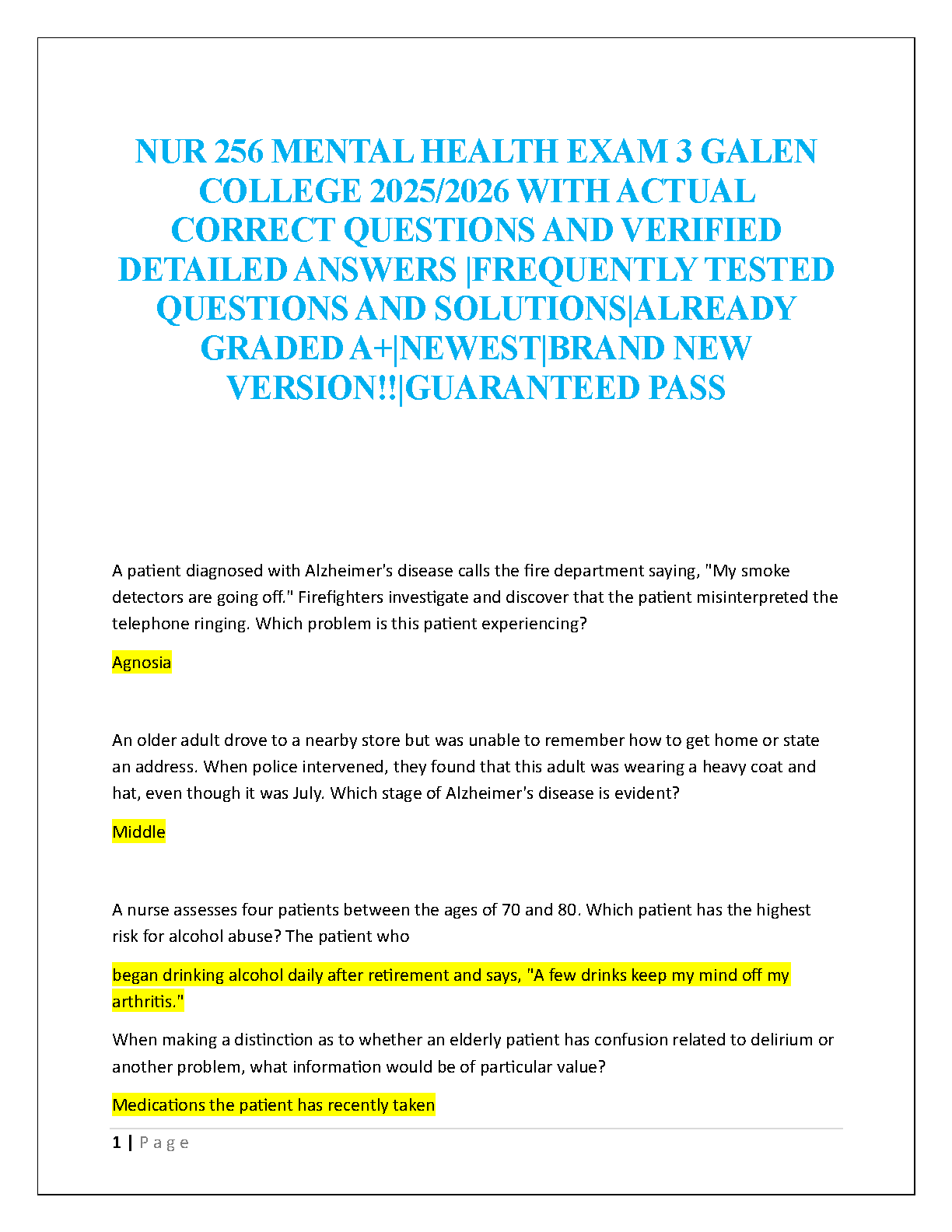 Master your Galen College NUR 256 Mental Health Exam 3 with this comprehensive study resource for the 2025/2026 academic year. Featuring actual exam questions, meticulously verified answers, and detailed solutions, this guide is designed to help students achieve an A+ and guarantee a pass, preventing resits. Focus on frequently tested topics and understand the reasoning behind each answer to build confidence and excel in your first attempt.